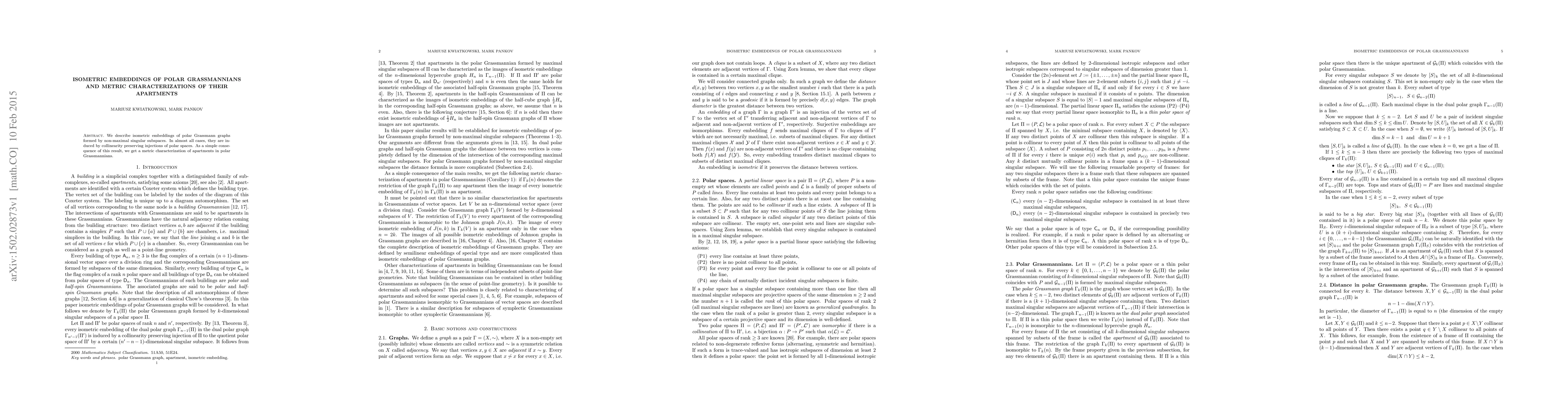 This paper investigates isometric embeddings of polar Grassmannians' subgraphs, showing they generally arise from collinearity-preserving injections. The study yields a metric characterization of the apartments within these polar Grassmannians.