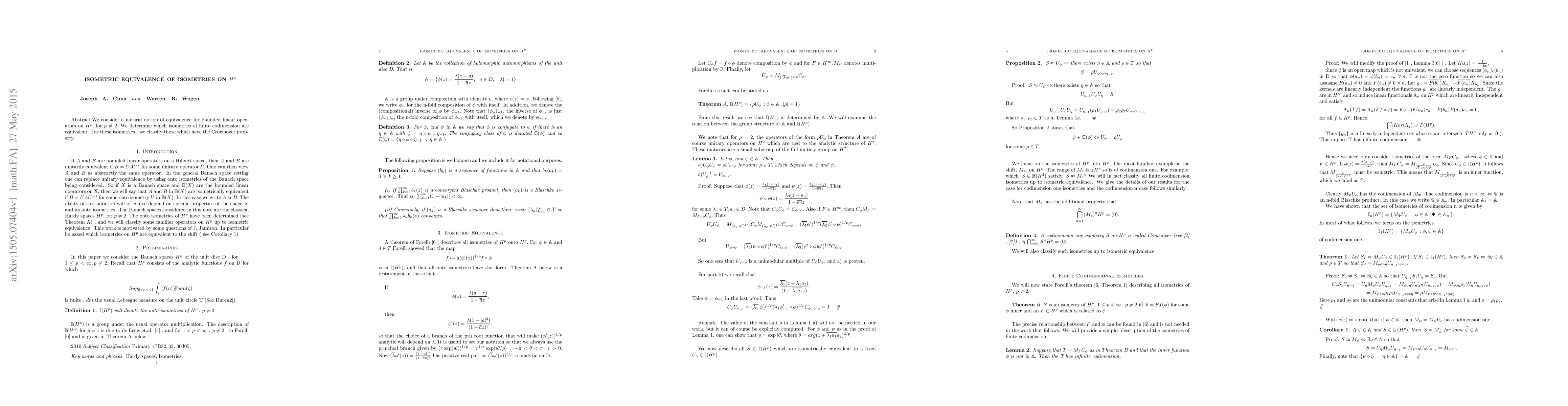 We consider a natural notion of equivalence for bounded linear operators on $H^p,$ for $p\neq 2.$ We determine which isometries of finite codimension are equivalent. For these isometries , we classify those which have the Crownover property.