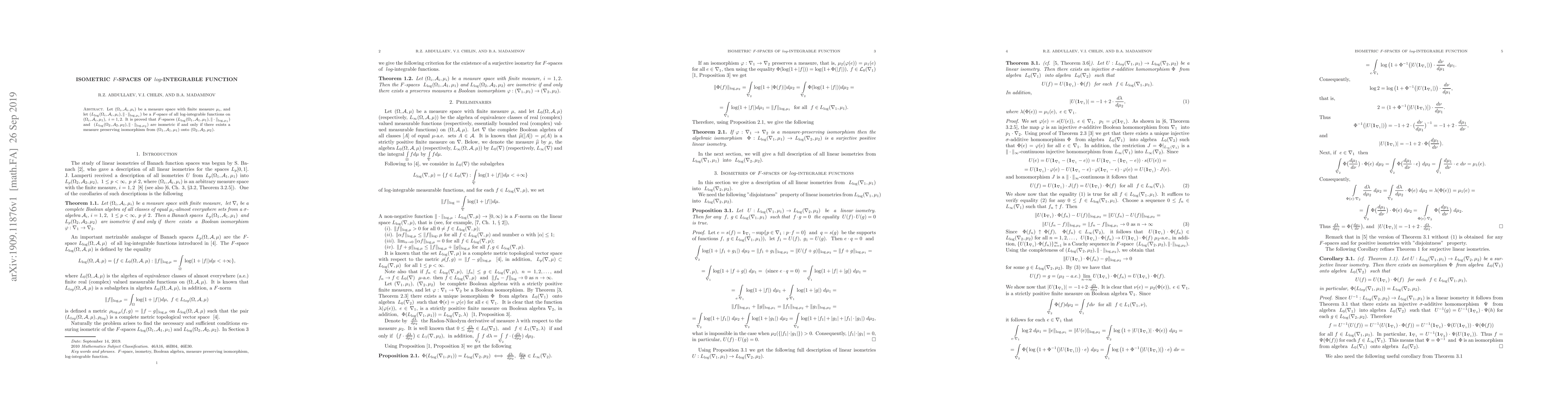 Two $F$-spaces of $ eg log$-integrable functions on different measure spaces are isometric if and only if there exists a measure-preserving isomorphism between the spaces.