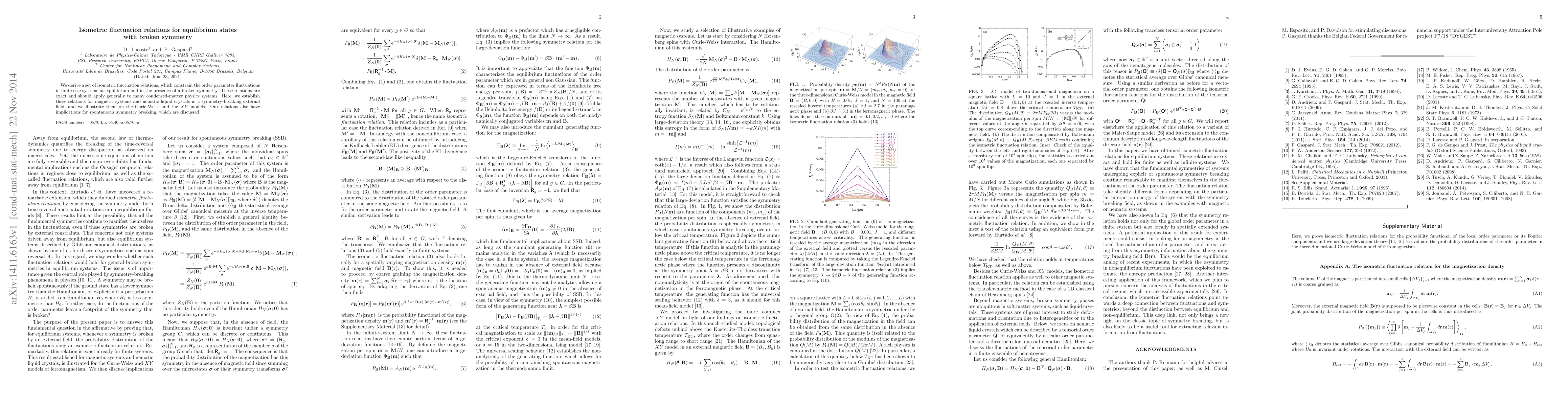 This paper derives exact isometric fluctuation relations for equilibrium states with broken symmetry, applying to condensed-matter systems like magnetic systems and nematic liquid crystals. These relations constrain order parameter fluctuations and have implications for spontaneous symmetry breaking.