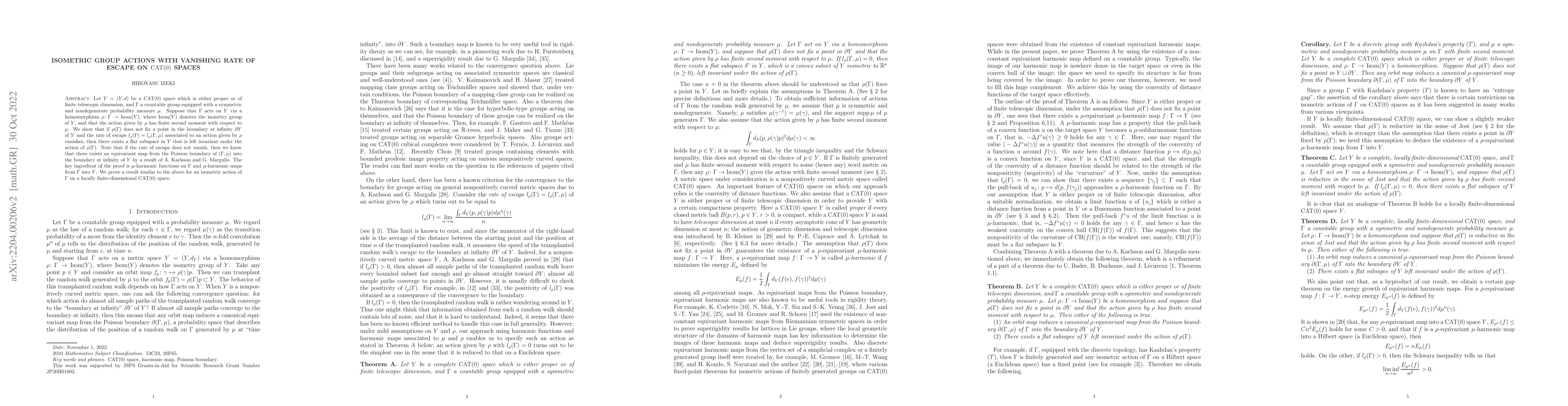 This paper demonstrates that an isometric action of a finitely generated group on a CAT(0) space with a vanishing rate of escape and no fixed boundary points results in the existence of a left-invariant flat subspace. The proof leverages an equivariant $\mu$-harmonic map from the group to the space.