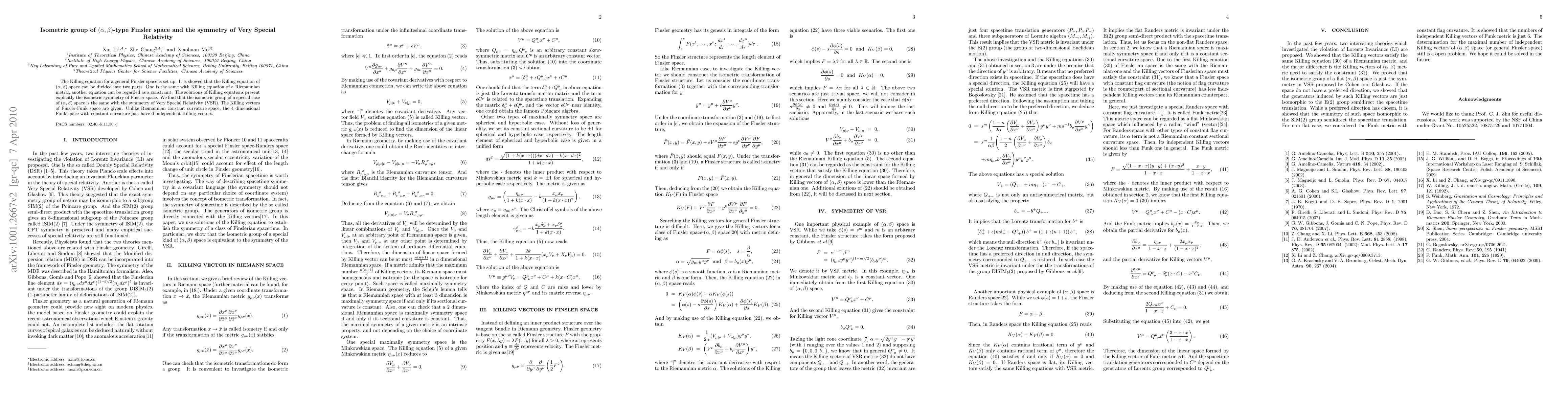 The paper investigates the isometric group of a $(α,β)$-type Finsler space and finds that it shares the same symmetry as Very Special Relativity in a special case.
