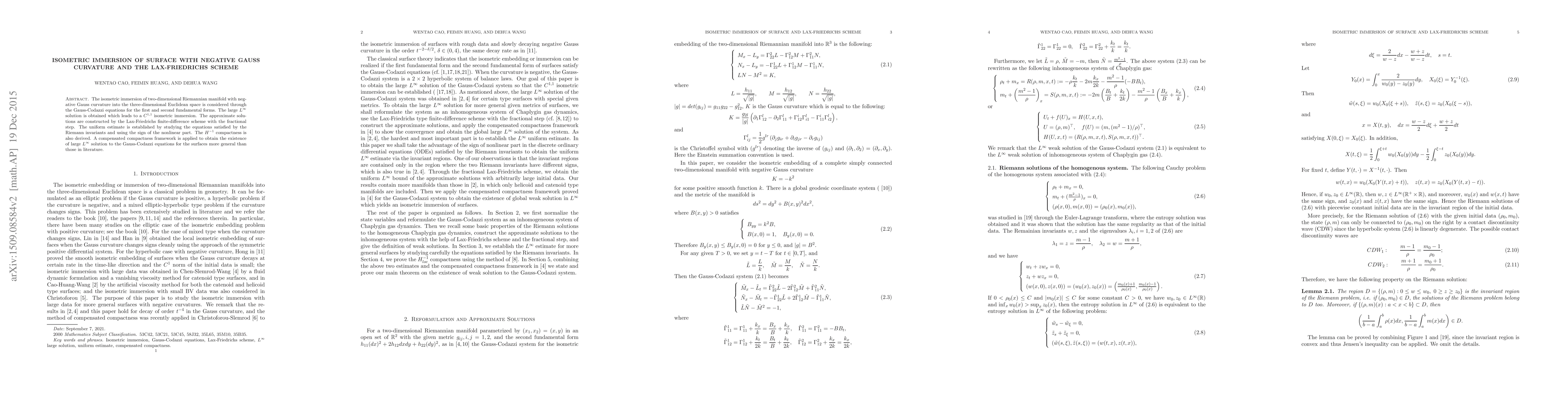 This paper investigates the isometric immersion of surfaces with negative Gauss curvature into three-dimensional Euclidean space, deriving a large $L^\infty$ solution and constructing approximate solutions via the Lax-Friedrichs scheme. The study establishes uniform estimates and $H^{-1}$ compactness, applying a compensated compactness framework to generalize existing results.