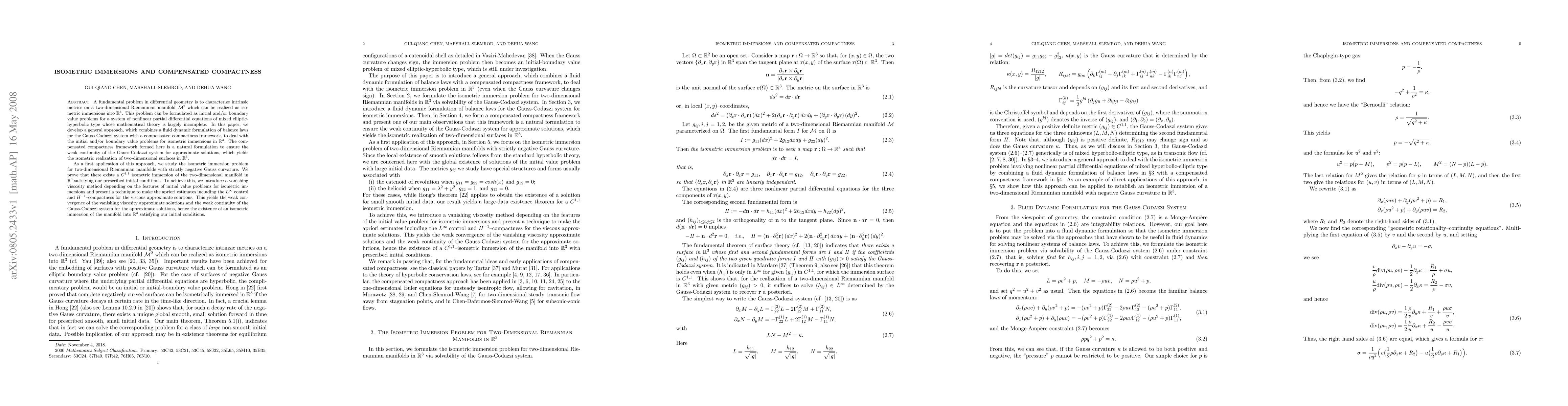 This paper develops a new method combining fluid dynamics and compensated compactness to address the initial and boundary value problems for isometric immersions of two-dimensional Riemannian manifolds into $\R^3$. The approach ensures weak continuity of the Gauss-Codazzi system, leading to the existence of $C^{1,1}$ isometric immersions for manifolds with strictly negative Gauss curvature.