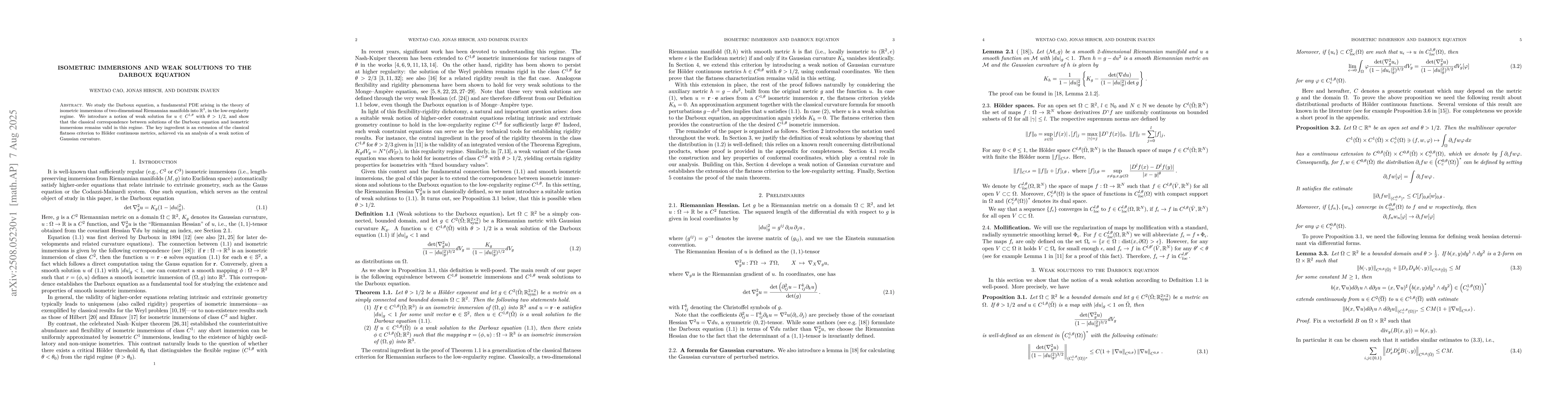 We study the Darboux equation, a fundamental PDE arising in the theory of isometric immersions of two-dimensional Riemannian manifolds into $\mathbb{R}^3$, in the low-regularity regime. We introduce a notion of weak solution for $u\in C^{1,\theta}$ with $\theta>1/2$, and show that the classical correspondence between solutions of the Darboux equation and isometric immersions remains valid in this regime. The key ingredient is an extension of the classical flatness criterion to H\"older continuous metrics, achieved via an analysis of a weak notion of Gaussian curvature.