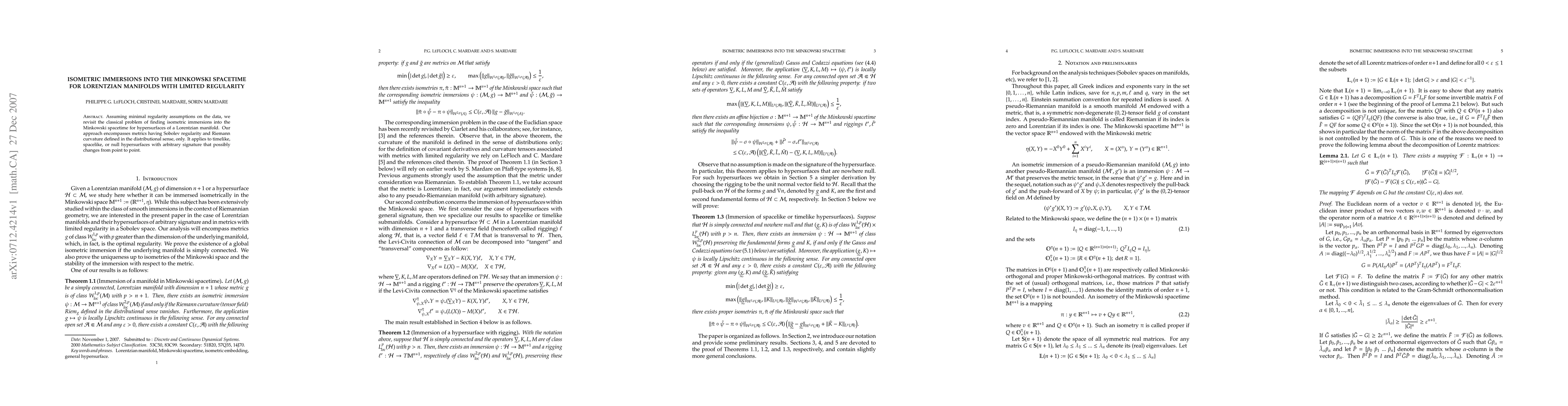 This paper explores isometric immersions of Lorentzian manifolds into Minkowski spacetime under minimal regularity conditions, including Sobolev metrics and distributional curvature, applicable to timelike, spacelike, or null hypersurfaces with variable signature.
