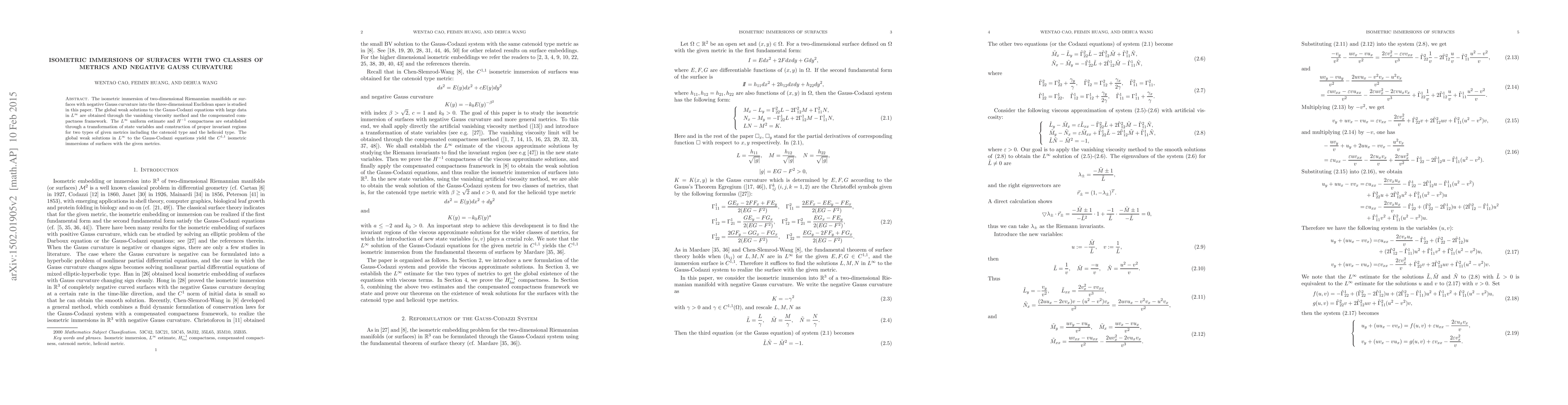 This paper studies isometric immersions of negatively curved surfaces into three-dimensional Euclidean space, obtaining global weak solutions via the vanishing viscosity method and compensated compactness. It establishes uniform $L^\infty$ estimates and $H^{-1}$ compactness for two metric classes, leading to $L^\infty$ isometric immersions.