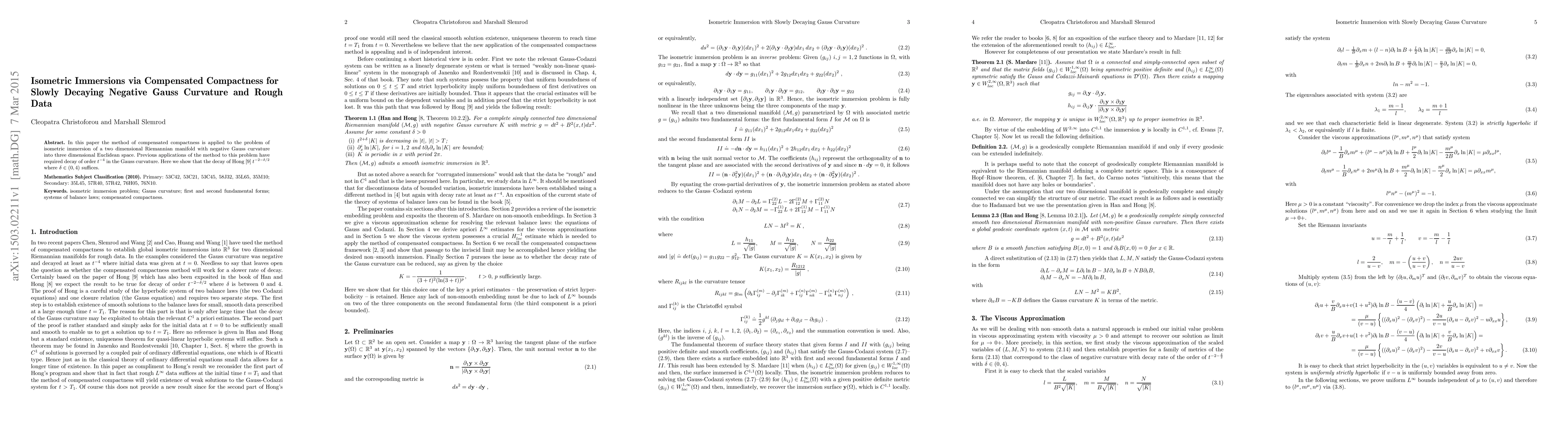 In this paper the method of compensated compactness is applied to the problem of isometric immersion of a two dimensional Riemannian manifold with negative Gauss curvature into three dimensional Euclidean space. Previous applications of the method to this problem have required decay of order $t^{-4}$ in the Gauss curvature. Here we show that the decay of Hong $t^{-2-\delta/2}$ where $\delta\in(0,4)$ suffices.