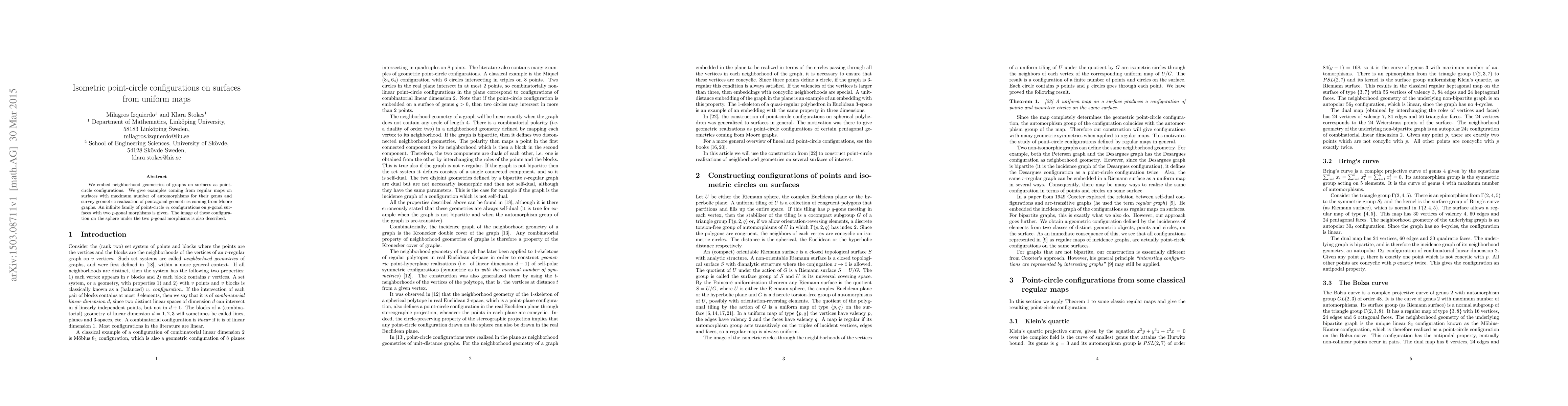 This paper explores isometric point-circle configurations derived from uniform maps on surfaces, focusing on regular maps with maximal automorphisms and Moore graphs. It presents an infinite family of $v_4$ configurations on $p$-gonal surfaces and describes their images on the sphere under $p$-gonal morphisms.