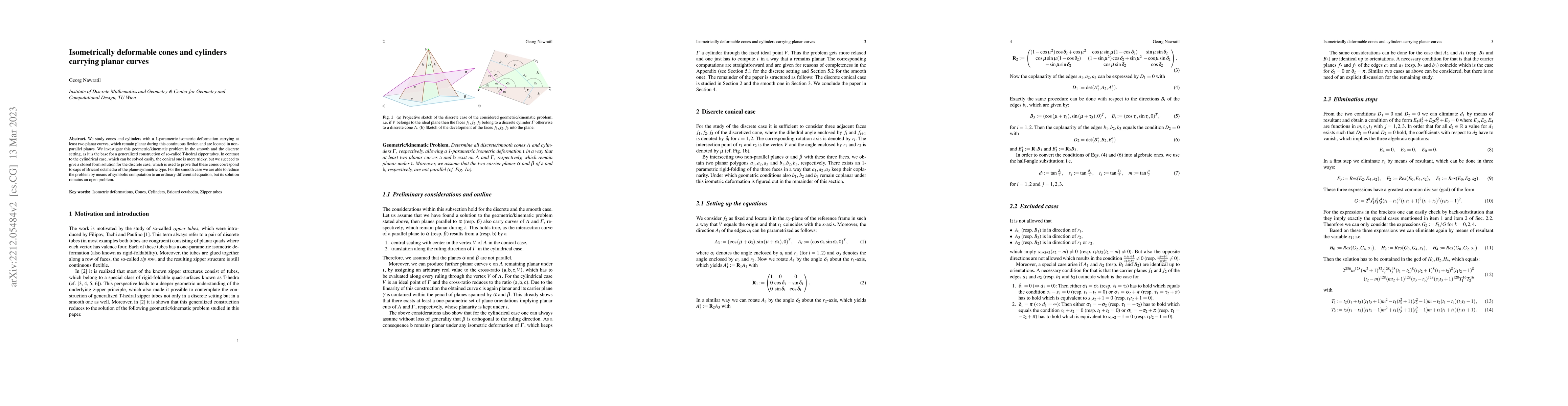 We study cones and cylinders with a 1-parametric isometric deformation carrying at least two planar curves, which remain planar during this continuous flexion and are located in non-parallel planes. We investigate this geometric/kinematic problem in the smooth and the discrete setting, as it is the base for a generalized construction of so-called T-hedral zipper tubes. In contrast to the cylindrical case, which can be solved easily, the conical one is more tricky, but we succeed to give a closed form solution for the discrete case, which is used to prove that these cones correspond to caps of Bricard octahedra of the plane-symmetric type. For the smooth case we are able to reduce the problem by means of symbolic computation to an ordinary differential equation, but its solution remains an open problem.