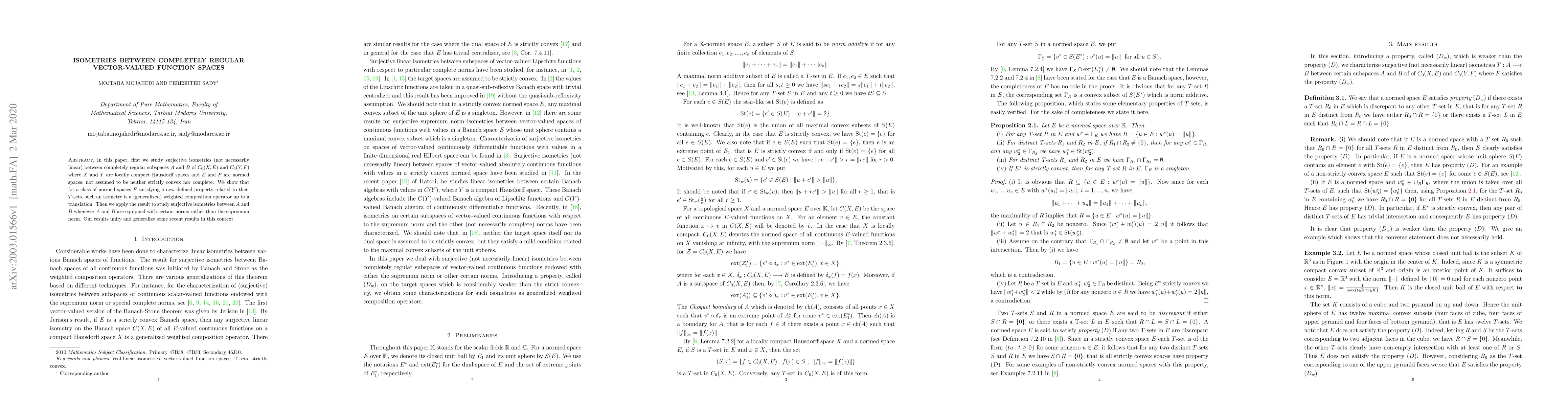 In this paper, first we study surjective isometries (not necessarily linear) between completely regular subspaces $A$ and $B$ of $C_0(X,E)$ and $C_0(Y,F)$ where $X$ and $Y$ are locally compact Hausdorff spaces and $E$ and $F$ are normed spaces, not assumed to be neither strictly convex nor complete. We show that for a class of normed spaces $F$ satisfying a new defined property related to their $T$-sets, such an isometry is a (generalized) weighted composition operator up to a translation. Then we apply the result to study surjective isometries between $A$ and $B$ whenever $A$ and $B$ are equipped with certain norms rather than the supremum norm. Our results unify and generalize some recent results in this context.