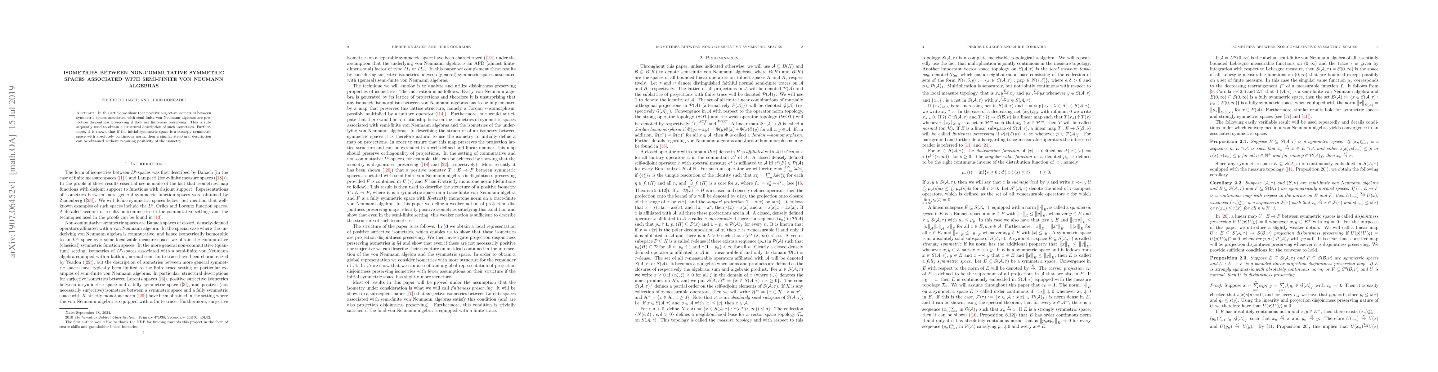 In this article we show that positive surjective isometries between symmetric spaces associated with semi-finite von Neumann algebras are projection disjointness preserving if they are finiteness preserving. This is subsequently used to obtain a structural description of such isometries. Furthermore, it is shown that if the initial symmetric space is a strongly symmetric space with absolutely continuous norm, then a similar structural description can be obtained without requiring positivity of the isometry.