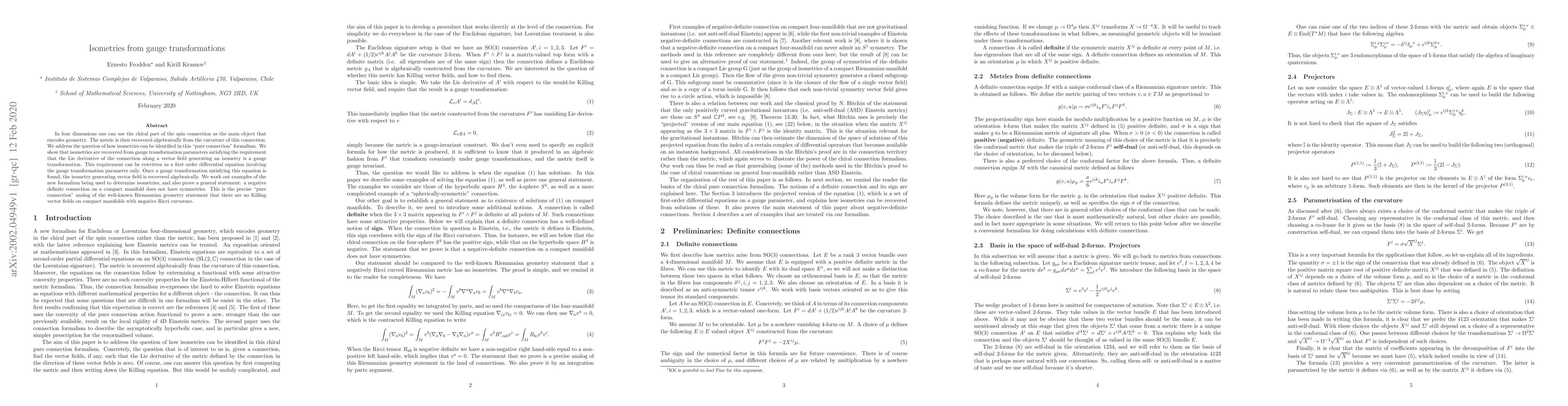 The paper uses gauge transformations and the chiral part of the spin connection to identify isometries in a 'pure connection' formalism, where the metric is recovered algebraically from the curvature of this connection.