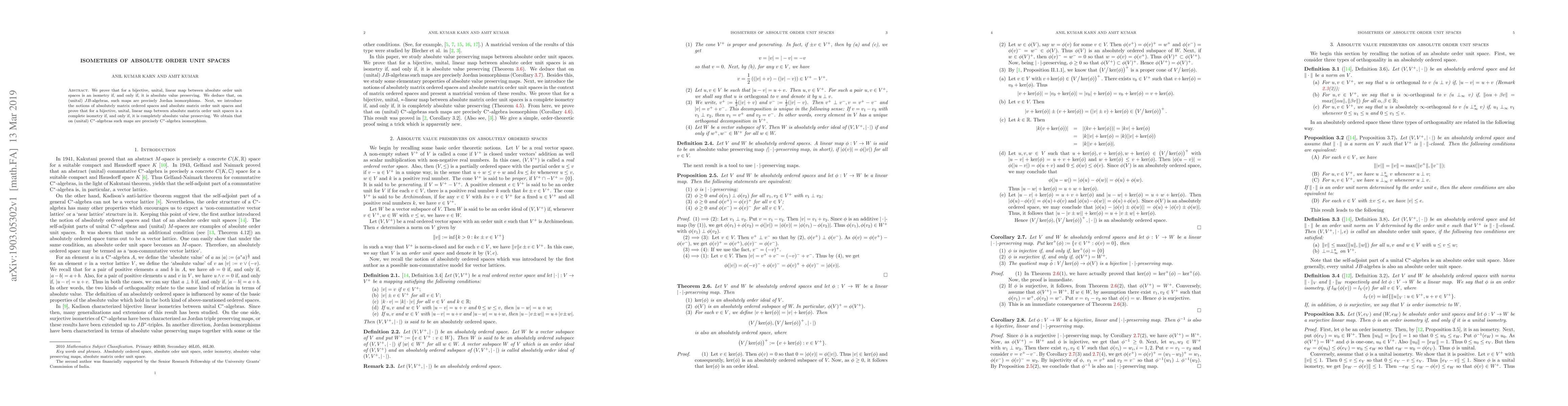 We prove that for a bijective, unital, linear map between absolute order unit spaces is an isometry if, and only if, it is absolute value preserving. We deduce that, on (unital) $JB$-algebras, such maps are precisely Jordan isomorphisms. Next, we introduce the notions of absolutely matrix ordered spaces and absolute matrix order unit spaces and prove that for a bijective, unital, linear map between absolute matrix order unit spaces is a complete isometry if, and only if, it is completely absolute value preserving. We obtain that on (unital) C$^*$-algebras such maps are precisely C$^*$-algebra isomorphism.