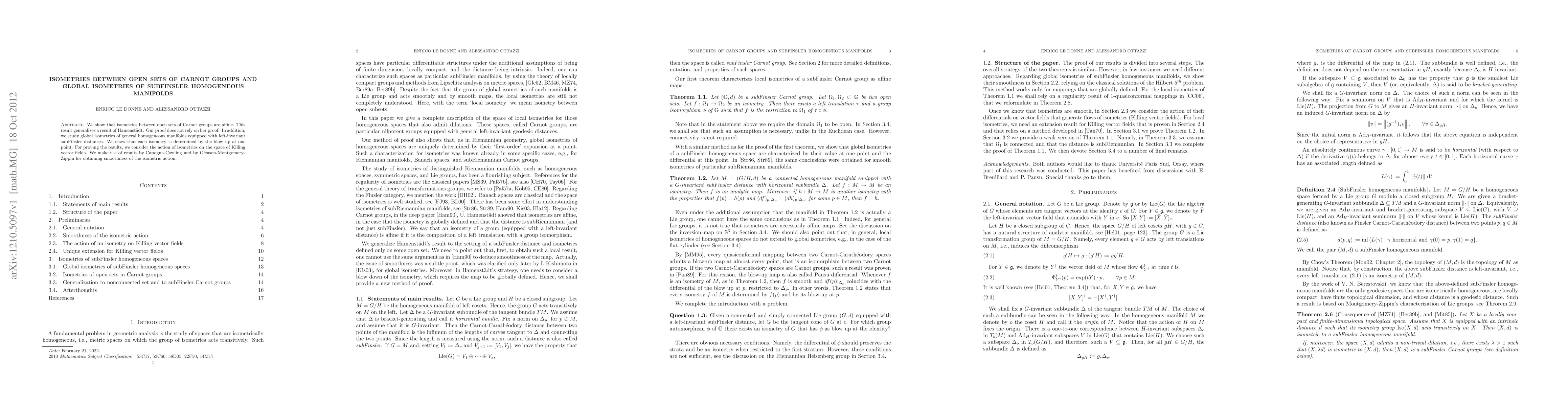 This paper demonstrates that isometries between open sets of Carnot groups are affine, extending a previous result by Hamenstädt. It also explores global isometries of subFinsler homogeneous manifolds, showing that they are determined by their behavior at a single point, using the action of isometries on Killing vector fields and leveraging results from Capogna-Cowling and Gleason-Montgomery-Zippin.