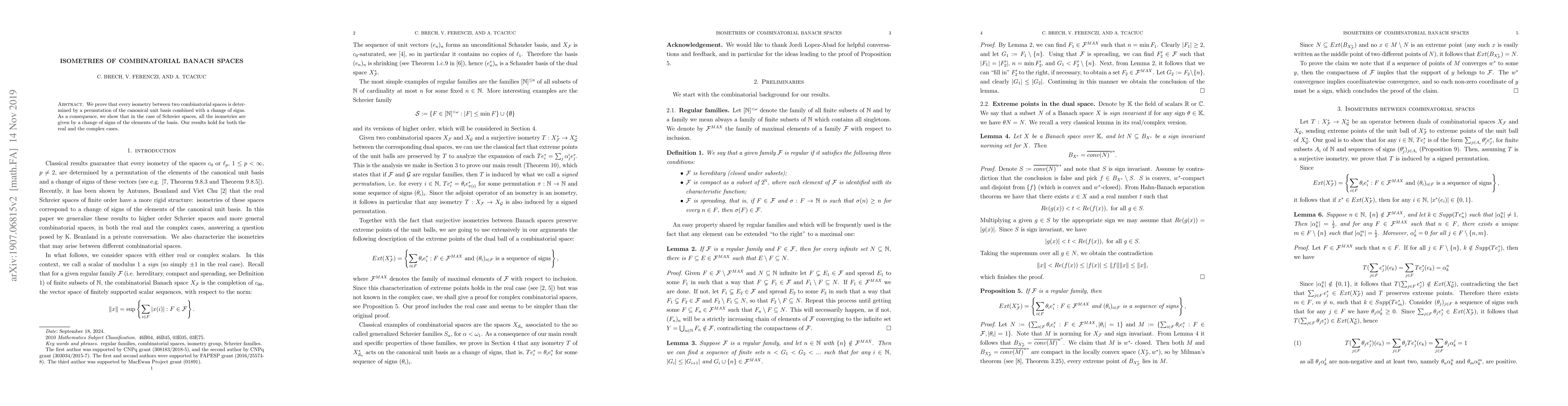 The paper proves results about isometries in combinatorial Banach spaces using spreading families and signed permutations of unit basis elements.