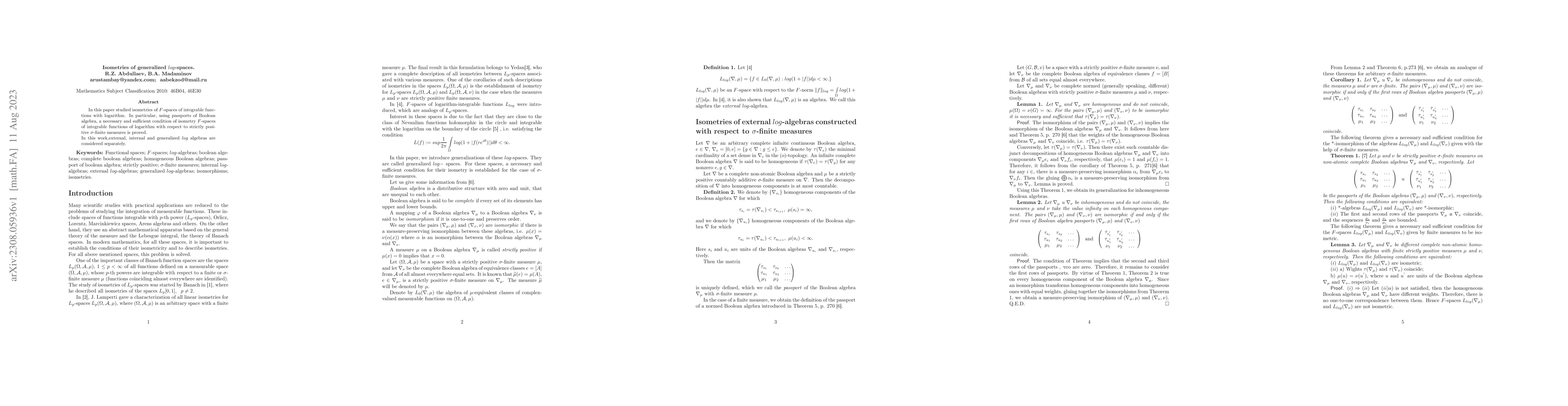 This paper investigates isometries of $F$-spaces of integrable functions with logarithms, proving a necessary and sufficient condition for isometry concerning strictly positive $\sigma$-finite measures. It examines external, internal, and generalized log algebras separately.