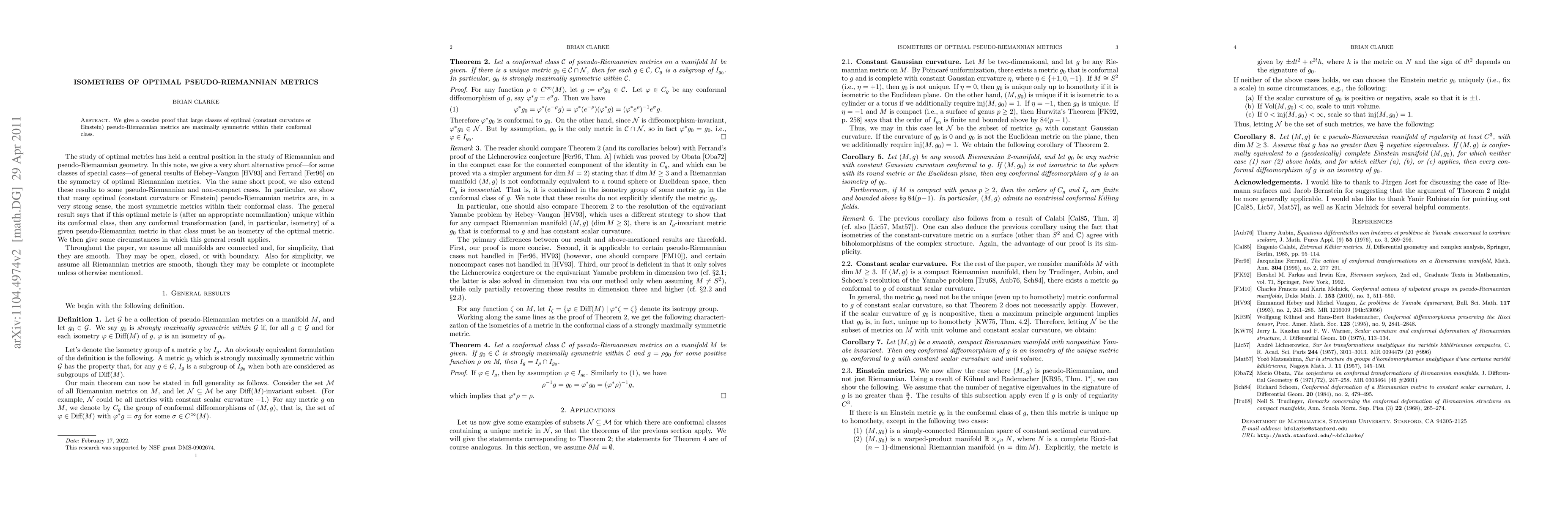 We give a concise proof that large classes of optimal (constant curvature or Einstein) pseudo-Riemannian metrics are maximally symmetric within their conformal class.