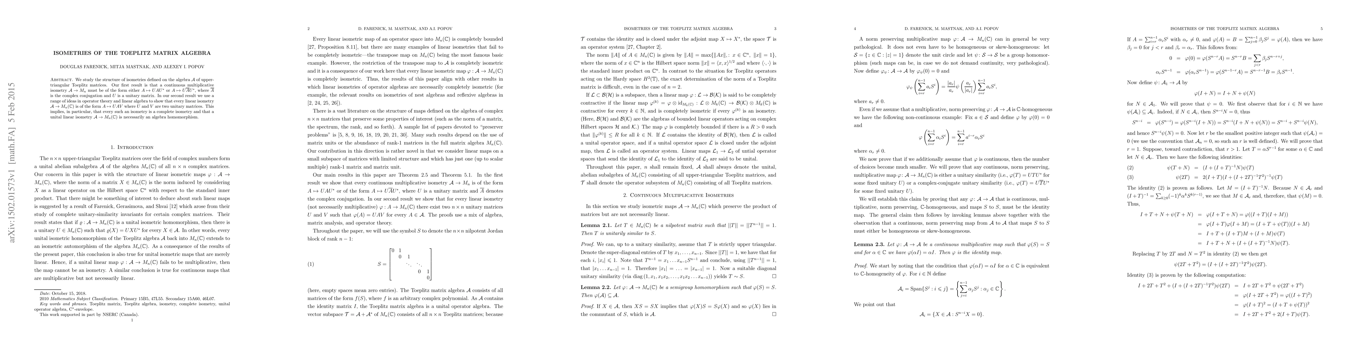 We study the structure of isometries defined on the algebra $\mathcal{A}$ of upper-triangular Toeplitz matrices. Our first result is that a continuous multiplicative isometry $\mathcal{A}\to M_n$ must be of the form either $A\mapsto UAU^*$ or $A\mapsto U\overline AU^*$, where $\overline A$ is the complex conjugation and $U$ is a unitary matrix. In our second result we use a range of ideas in operator theory and linear algebra to show that every linear isometry $\mathcal{A}\to M_n(\mathbb{C})$ is of the form $A\mapsto UAV$ where $U$ and $V$ are two unitary matrices. This implies, in particular, that every such an isometry is a complete isometry and that a unital linear isometry $\mathcal{A}\to M_n(\mathbb{C})$ is necessarily an algebra homomorphism.