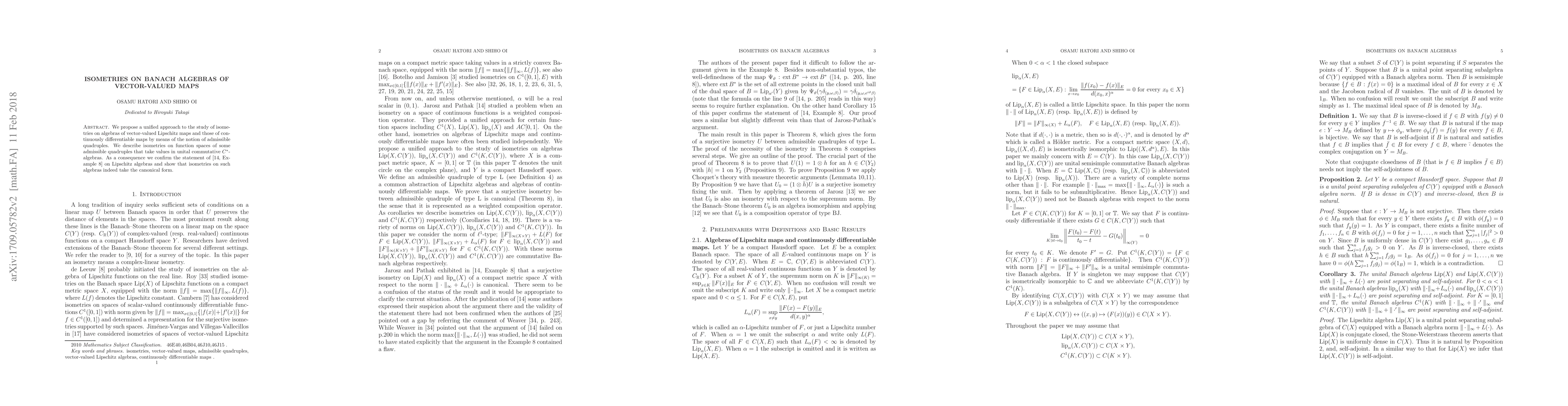 We propose a unified approach to the study of isometries on algebras of vector-valued Lipschitz maps and those of continuously differentiable maps by means of the notion of admissible quadruples. We describe isometries on function spaces of some admissible quadruples that take values in unital commutative $C^*$-algebras. As a consequence we confirm the statement of \cite[Example 8]{jp} on Lipschitz algebras and show that isometries on such algebras indeed take the canonical form.