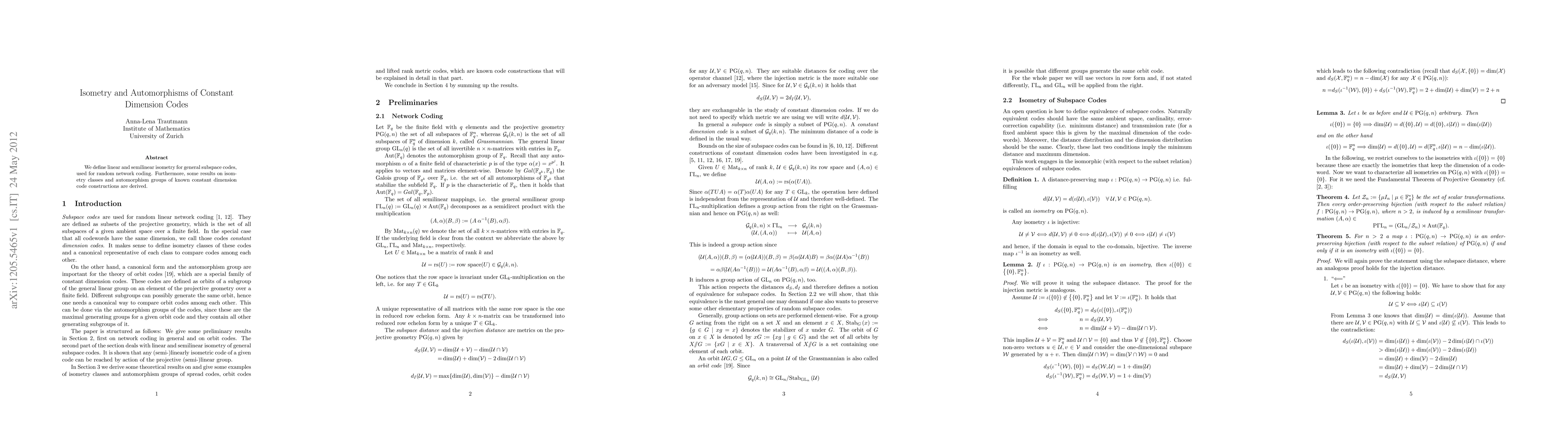 This research introduces linear and semilinear isometry for subspace codes, crucial in random network coding. It also provides insights into isometry classes and automorphism groups of established constant dimension code constructions.