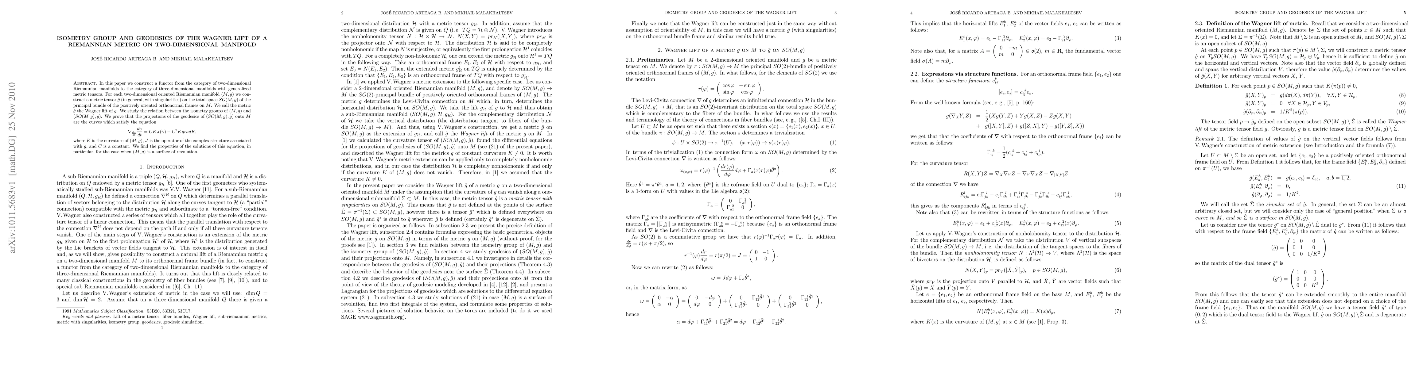 In this paper we construct a functor from the category of two-dimensional Riemannian manifolds to the category of three-dimensional manifolds with generalized metric tensors. For each two-dimensional oriented Riemannian manifold $(M,g)$ we construct a metric tensor $\hat g$ (in general, with singularities) on the total space $SO(M,g)$ of the principal bundle of the positively oriented orthonormal frames on $M$. We call the metric $\hat g$ the Wagner lift of $g$. We study the relation between the isometry groups of $(M,g)$ and $(SO(M,g),\hat g)$. We prove that the projections of the geodesics of $(SO(M,g),\hat g)$ onto $M$ are the curves which satisfy the equation \begin{equation*} \nabla_{\frac{d\gamma}{dt}}\frac{d\gamma}{dt} = C K J (\dot\gamma) - C^2 K grad K, \end{equation*} where $K$ is the curvature of $(M,g)$, $J$ is the operator of the complex structure associated with $g$, and $C$ is a constant. We find the properties of the solutions of this equation, in particular, for the case when $(M,g)$ is a surface of revolution.
