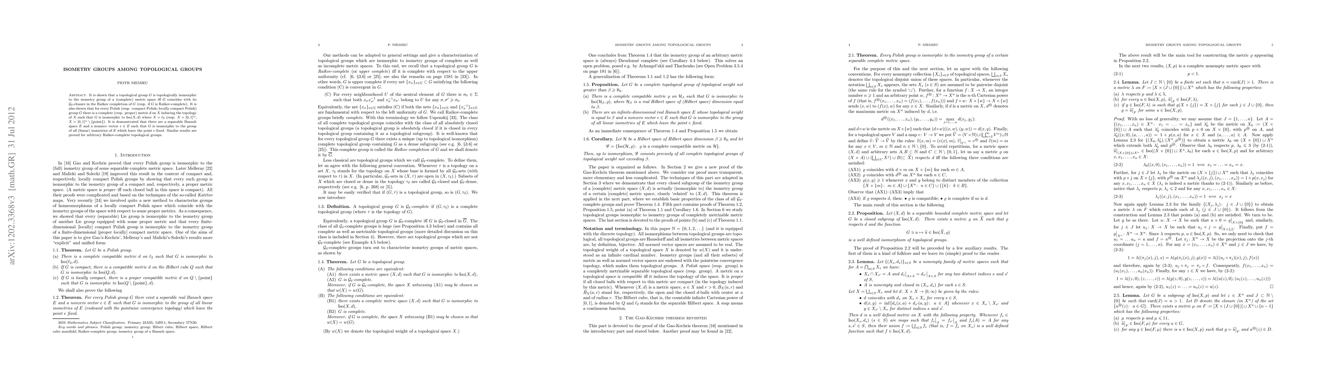 It is shown that a topological group G is topologically isomorphic to the isometry group of a (complete) metric space iff G coincides with its G-delta-closure in the Rajkov completion of G (resp. if G is Rajkov-complete). It is also shown that for every Polish (resp. compact Polish; locally compact Polish) group G there is a complete (resp. proper) metric d on X inducing the topology of X such that G is isomorphic to Iso(X,d) where X = l_2 (resp. X = Q; X = Q\{point} where Q is the Hilbert cube). It is demonstrated that there are a separable Banach space E and a nonzero vector e in E such that G is isomorphic to the group of all (linear) isometries of E which leave the point e fixed. Similar results are proved for an arbitrary complete topological group.