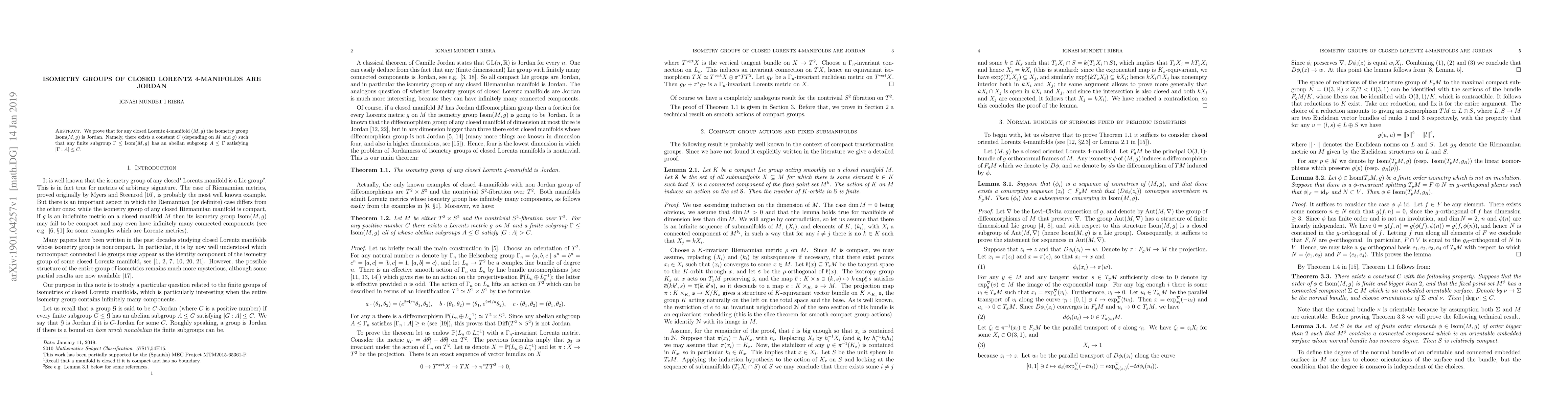 We prove that for any closed Lorentz $4$-manifold $(M,g)$ the isometry group $Isom(M,g)$ is Jordan. Namely, there exists a constant $C$ (depending on $M$ and $g$) such that any finite subgroup $\Gamma\leq Isom(M,g)$ has an abelian subgroup $A\leq\Gamma$ satisfying $[\Gamma:A]\leq C$.