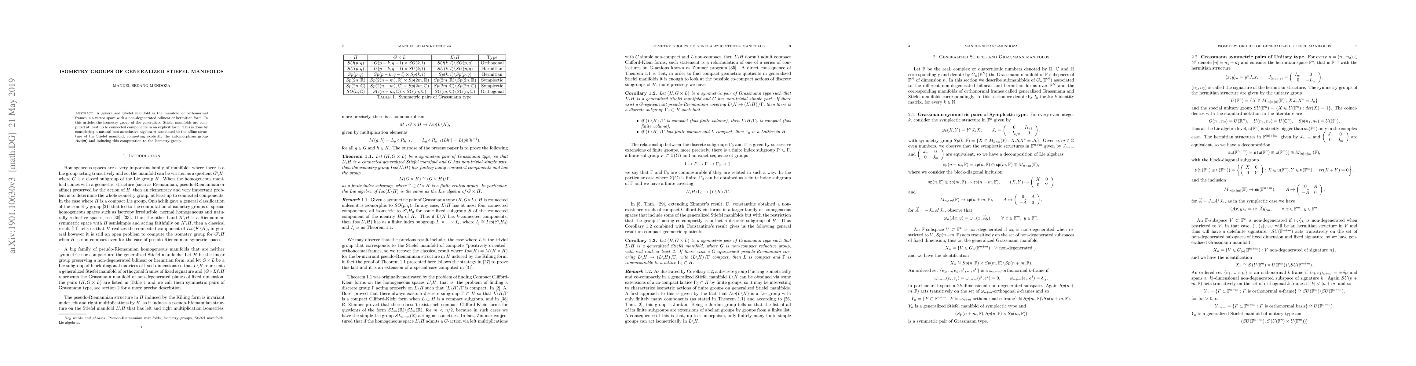 A generalized Stiefel manifold is the manifold of orthonormal frames in a vector space with a non-degenerated bilinear or hermitian form. In this article, the Isometry group of the generalized Stiefel manifolds are computed at least up to connected components in an explicit form. This is done by considering a natural non-associative algebra $\mathfrak{m}$ associated to the affine structure of the Stiefel manifold, computing explicitly the automorphism group $Aut(\mathfrak{m})$ and inducing this computation to the Isometry group.