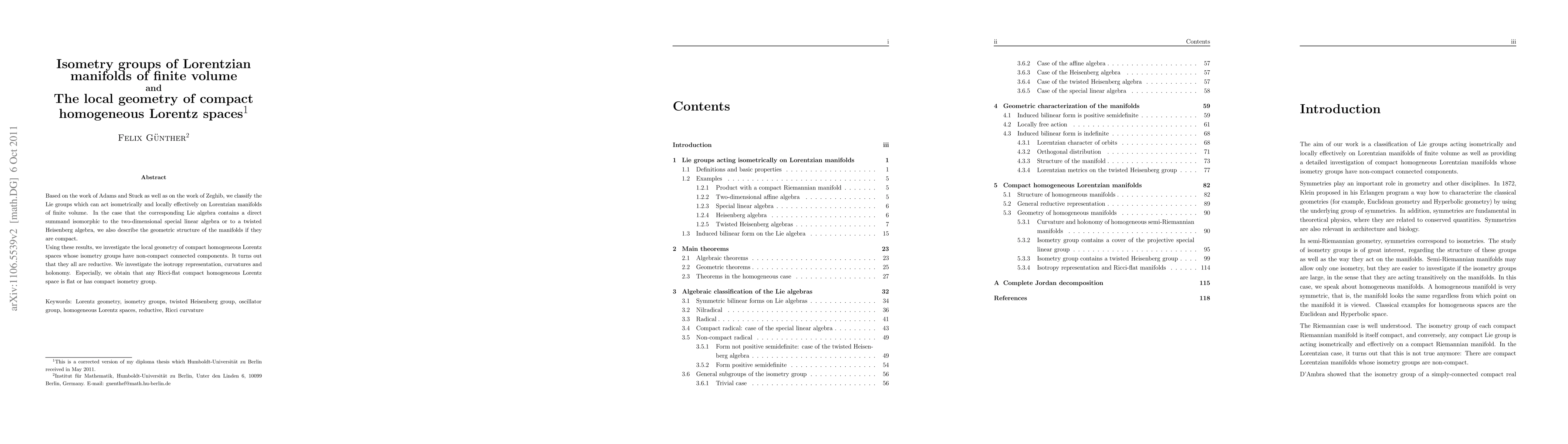 This paper classifies Lie groups acting isometrically and locally effectively on finite volume Lorentzian manifolds, describing the geometric structure when certain Lie algebra components are present. It further explores the local geometry of compact homogeneous Lorentz spaces with non-compact isometry groups, revealing they are reductive, and demonstrates that Ricci-flat such spaces are either flat or have compact isometry groups.
