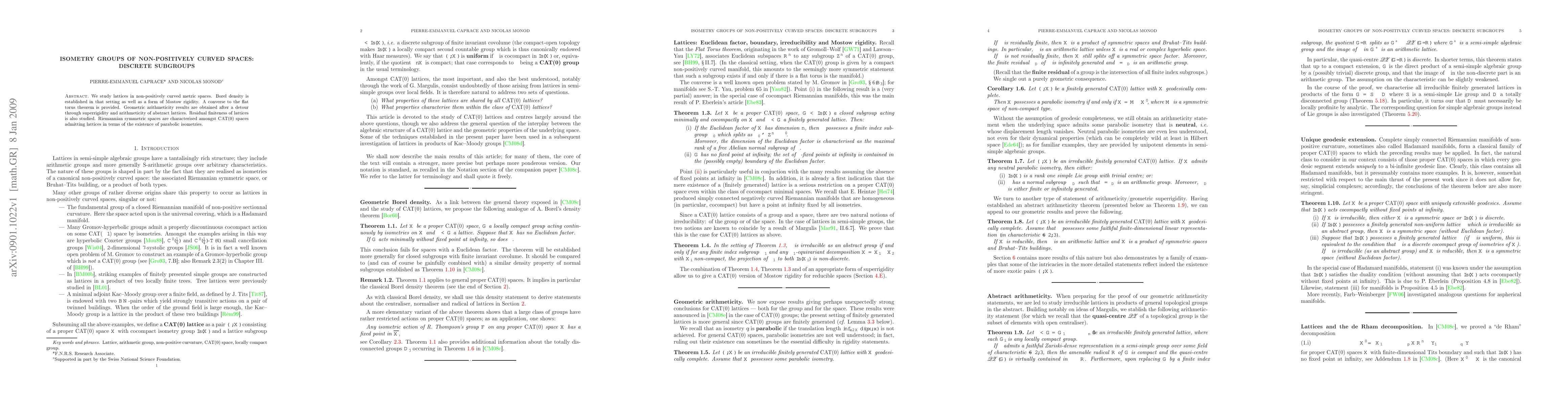 This paper investigates lattices within non-positively curved metric spaces, establishing Borel density and Mostow rigidity, and proves a converse to the flat torus theorem. It also explores geometric arithmeticity via superrigidity and residual finiteness, characterizing Riemannian symmetric spaces in CAT(0) spaces based on the presence of parabolic isometries.