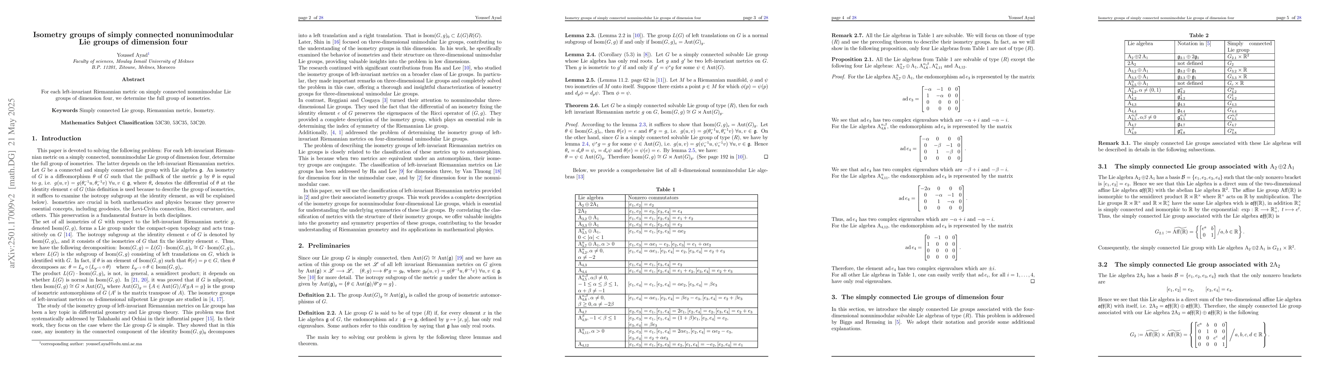 Summary: This paper investigates the isometry groups of simply connected nonunimodular Lie groups with four dimensions, determining the complete set of isometries for each left-invariant Riemannian metric. The study focuses on the geometric properties of these groups.