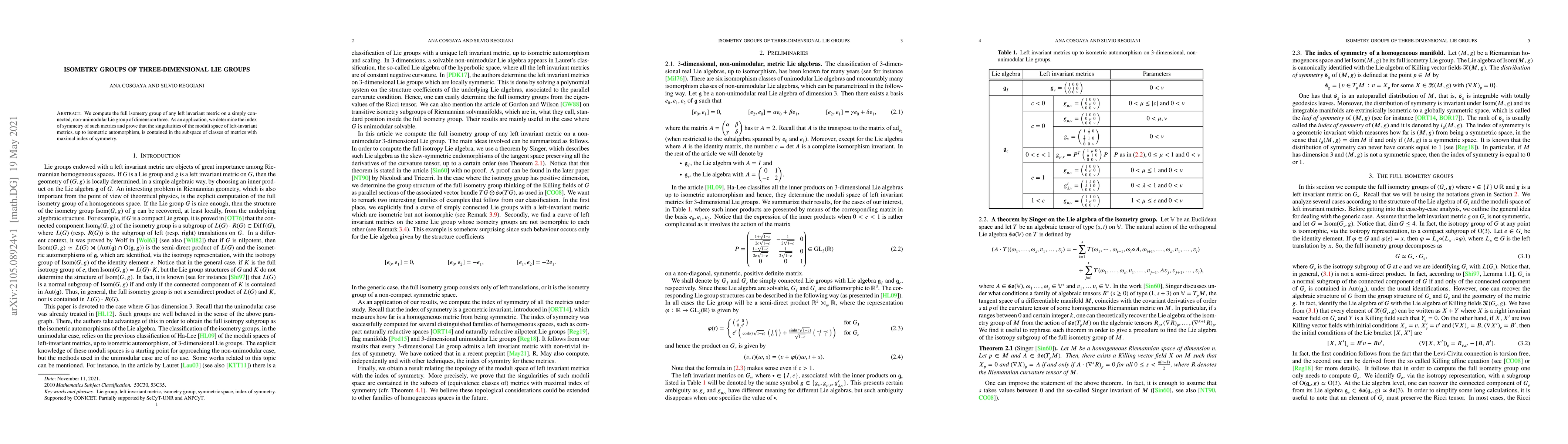 Summary: The paper computes the isometry groups of left-invariant metrics on three-dimensional, simply connected, non-unimodular Lie groups, determining their index of symmetry and showing that metric moduli space singularities lie within the subclass of metrics with maximal symmetry.