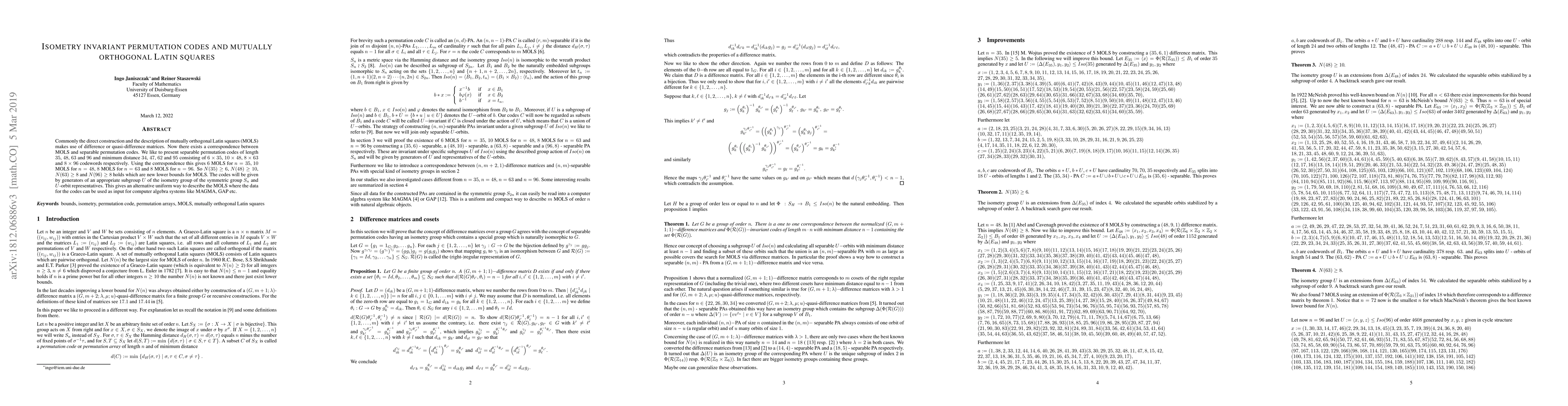 Researchers have found new lower bounds for mutually orthogonal Latin squares (MOLS) using isometry invariant permutation codes, discovering at least 6 MOLS for n=35, 10 MOLS for n=48, and at least 8 MOLS for n=63 and n=96.