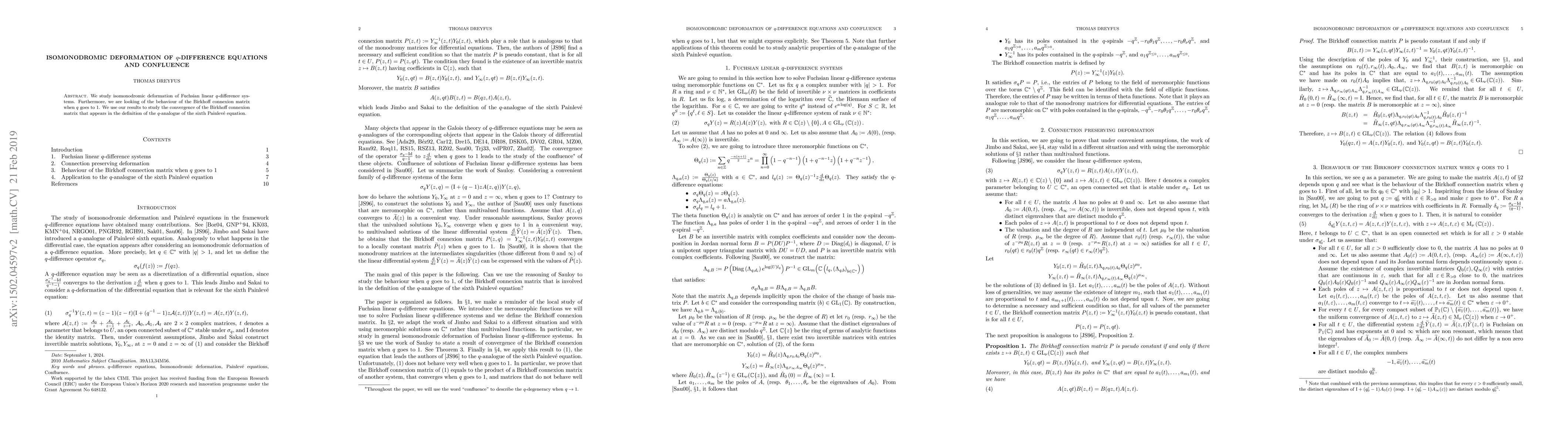 This paper investigates the isomonodromic deformation of Fuchsian linear q-difference systems and examines the behavior of the Birkhoff connexion matrix as q approaches 1. The findings are applied to study the convergence of the Birkhoff connexion matrix in the q-analogue of the sixth Painlevé equation.