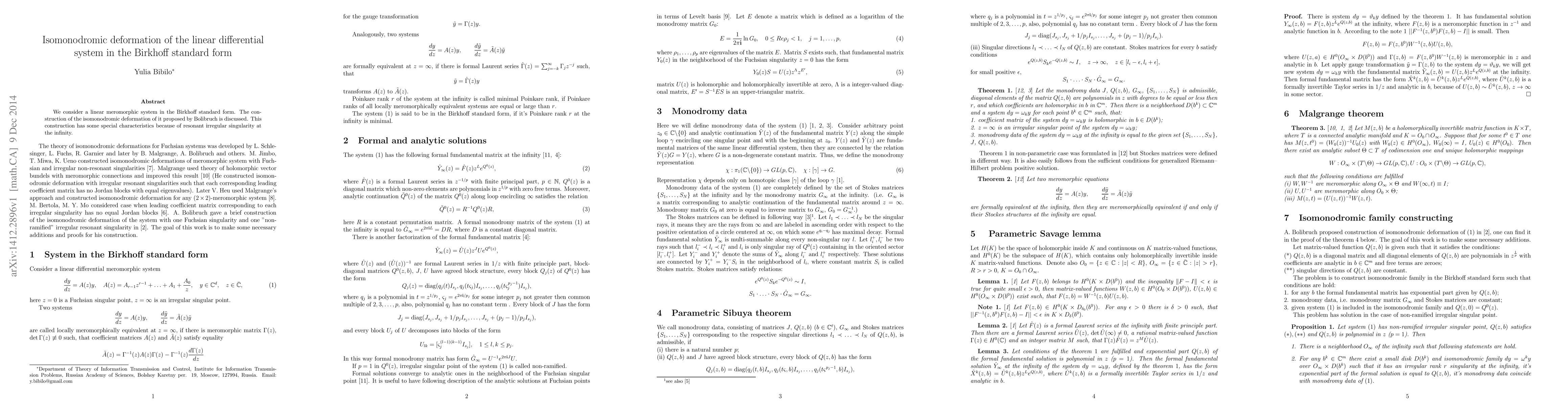 Summary: This paper explores the isomonodromic deformation of a linear meromorphic system in Birkhoff standard form, focusing on Bolibruch's construction, which is unique due to the presence of a resonant irregular singularity at infinity.