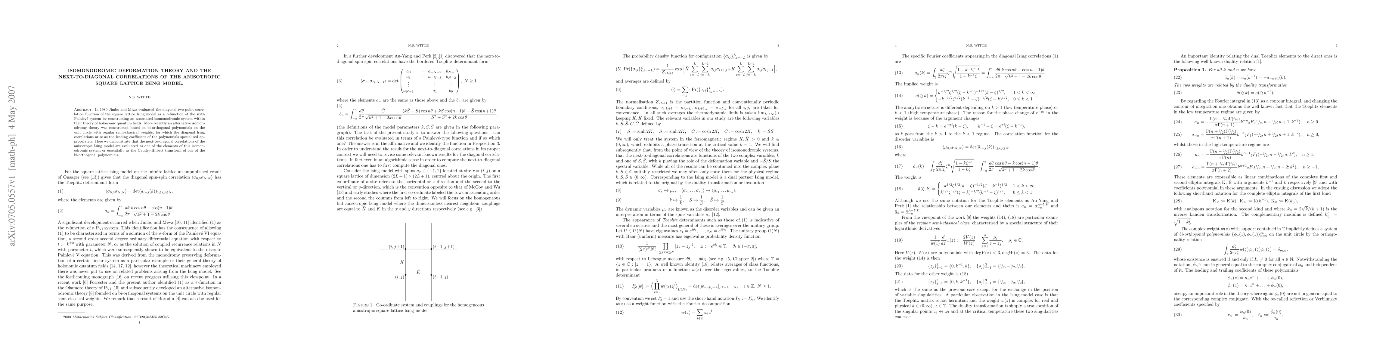 This paper evaluates the next-to-diagonal correlations of the anisotropic square lattice Ising model using isomonodromic deformation theory, showing they relate to bi-orthogonal polynomials on the unit circle. The results are derived from the Cauchy-Hilbert transform of these polynomials.
