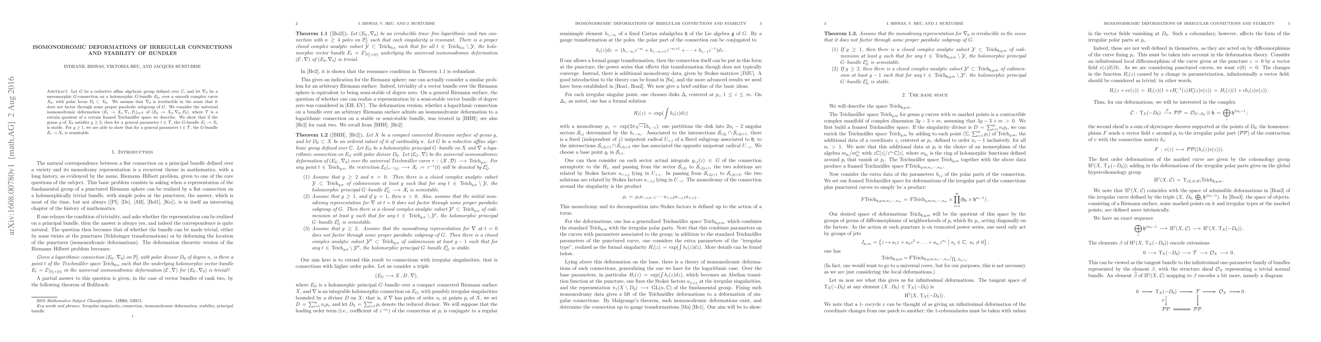 Let $G$ be a reductive affine algebraic group defined over $\mathbb C$, and let $\nabla_0$ be a meromorphic $G$-connection on a holomorphic $G$-bundle $E_0$, over a smooth complex curve $X_0$, with polar locus $P_0 \subset X_0$. We assume that $\nabla_0$ is irreducible in the sense that it does not factor through some proper parabolic subgroup of $G$. We consider the universal isomonodromic deformation $(E_t\to X_t, \nabla_t, P_t)_{t\in \mathcal{T}}$ of $(E_0\to X_0, \nabla_0, P_0)$, where $\mathcal{T}$ is a certain quotient of a certain framed Teichm\"uller space we describe. We show that if the genus $g$ of $X_0$ satisfies $g\geq 2$, then for a general parameter $t\in \mathcal{T}$, the $G$-bundle $E_t\to X_t$ is stable. For $g\geq 1$, we are able to show that for a general parameter $t\in \mathcal{T}$, the $G$-bundle $E_t\to X_t$ is semistable.