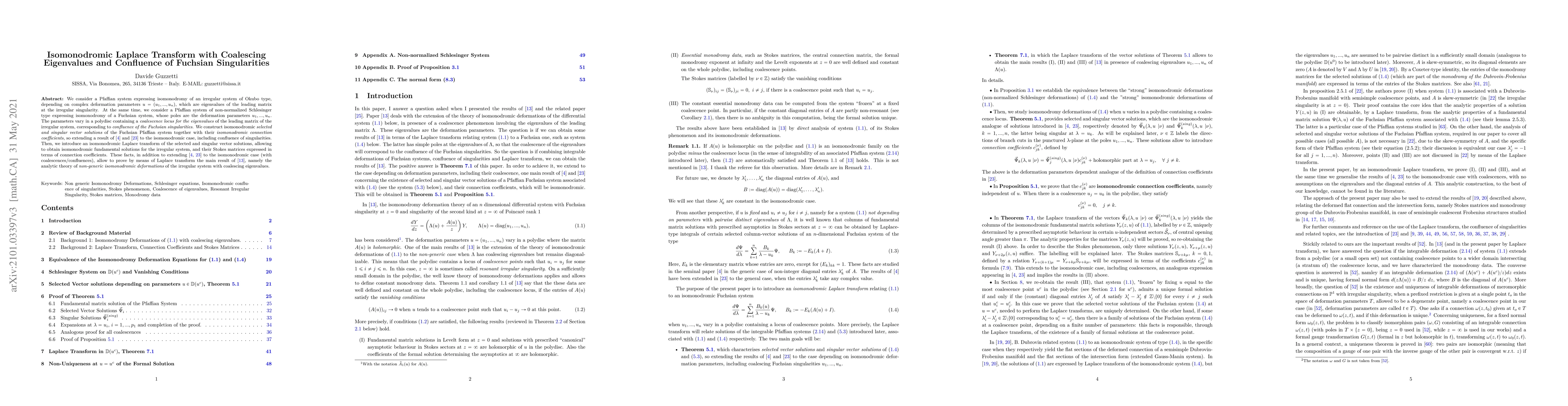 We consider a Pfaffian system expressing isomonodromy of an irregular system of Okubo type, depending on complex deformation parameters u=(u_1,...,u_n), which are eigenvalues of the leading matrix at the irregular singuilarity. At the same time, we consider a Pfaffian system of non-normalized Schlesinger type expressing isomonodromy of a Fuchsian system, whose poles are the deformation parameters u_1,...,u_n. The parameters vary in a polydisc containing a coalescence locus for the eigenvalues of the leading matrix of the irregular system, corresponding to confluence of the Fuchsian singularities. We construct isomonodromic selected and singular vector solutions of the Fuchsian Pfaffian system together with their isomonodromic connection coefficients, so extending a result of references [4] and [20] to the isomonodromic case, including confluence of singularities. Then, we introduce an isomonodromic Laplace transform of the selected and singular vector solutions, allowing to obtain isomonodromic fundamental solutions for the irregular system, and their Stokes matrices expressed in terms of connection coefficients. These facts, in addition to extending [4] and [20] to the isomonodromic case with coalescences/confluences, allow to prove by means of Laplace transform the main result of reference [11], which is the analytic theory of non-generic isomonodromic deformations of the irregular system with coalescing eigenvalues.