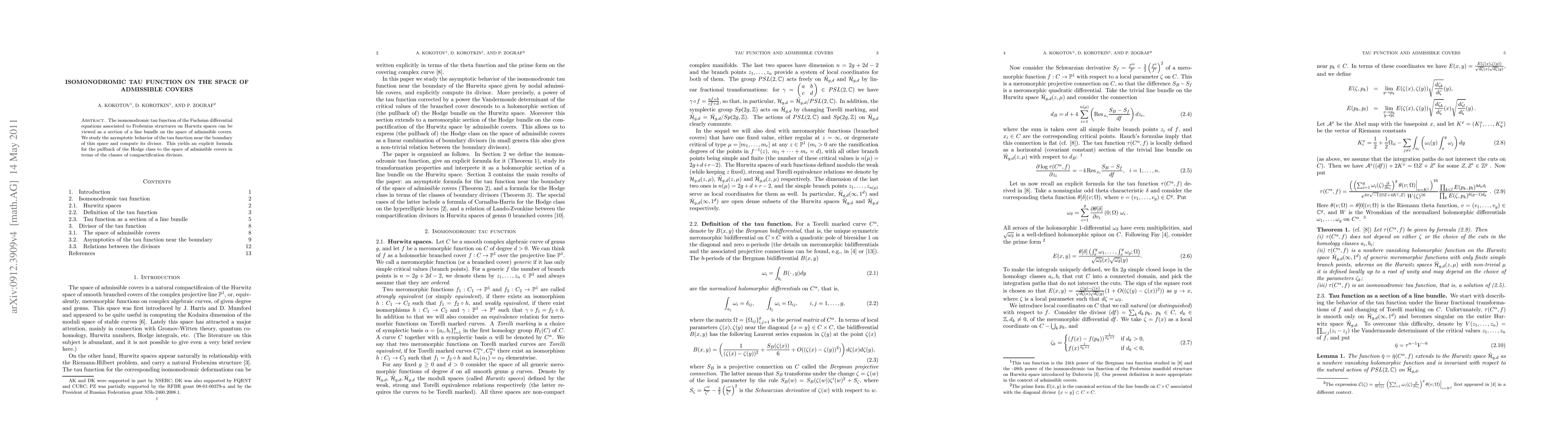 Summary: This paper investigates the isomonodromic tau function linked to Fuchsian differential equations on Hurwitz spaces, focusing on its asymptotic behavior near the boundary of admissible covers, and derives an explicit formula for the Hodge class in terms of compactification divisor classes.