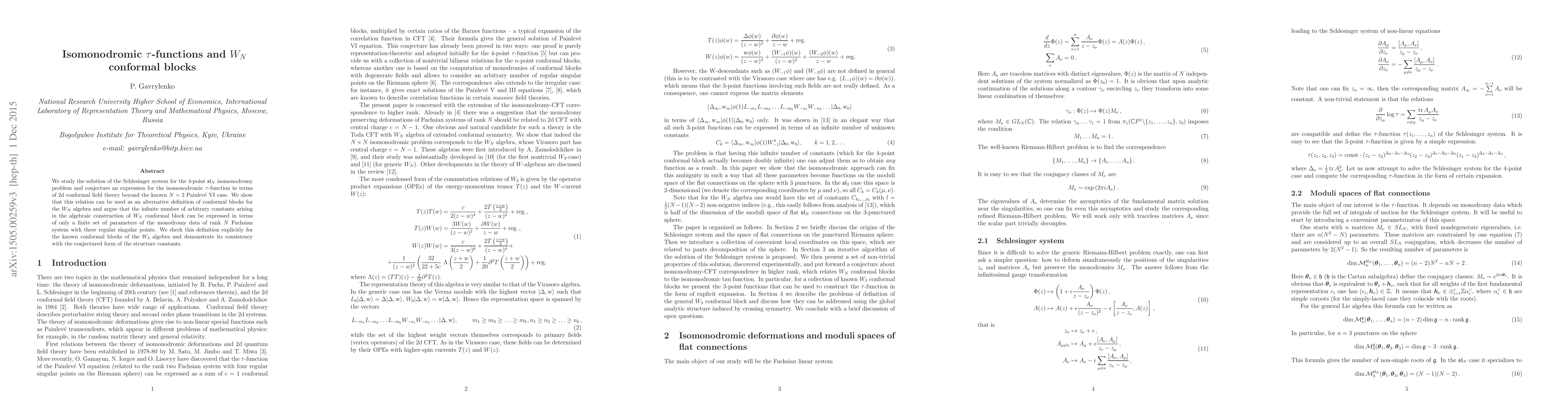 We study the solution of the Schlesinger system for the 4-point $\mathfrak{sl}_N$ isomonodromy problem and conjecture an expression for the isomonodromic $\tau$-function in terms of 2d conformal field theory beyond the known $N=2$ Painlev\'e VI case. We show that this relation can be used as an alternative definition of conformal blocks for the $W_N$ algebra and argue that the infinite number of arbitrary constants arising in the algebraic construction of $W_N$ conformal block can be expressed in terms of only a finite set of parameters of the monodromy data of rank $N$ Fuchsian system with three regular singular points. We check this definition explicitly for the known conformal blocks of the $W_3$ algebra and demonstrate its consistency with the conjectured form of the structure constants.