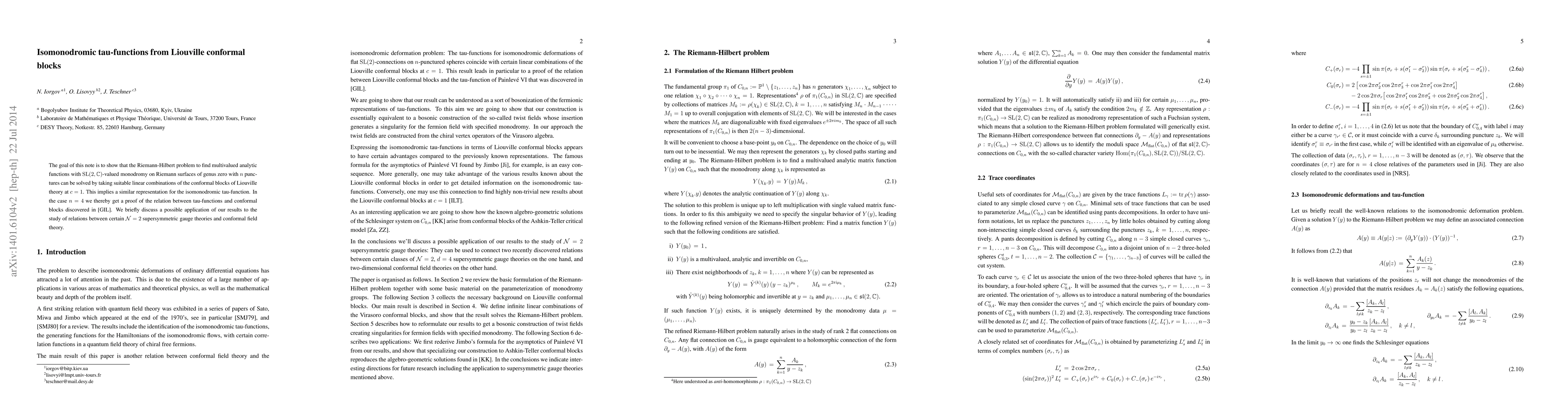The goal of this note is to show that the Riemann-Hilbert problem to find multivalued analytic functions with $SL(2,\mathbb{C})$-valued monodromy on Riemann surfaces of genus zero with $n$ punctures can be solved by taking suitable linear combinations of the conformal blocks of Liouville theory at $c=1$. This implies a similar representation for the isomonodromic tau-function. In the case $n=4$ we thereby get a proof of the relation between tau-functions and conformal blocks discovered in \cite{GIL}. We briefly discuss a possible application of our results to the study of relations between certain $\mathcal{N}=2$ supersymmetric gauge theories and conformal field theory.