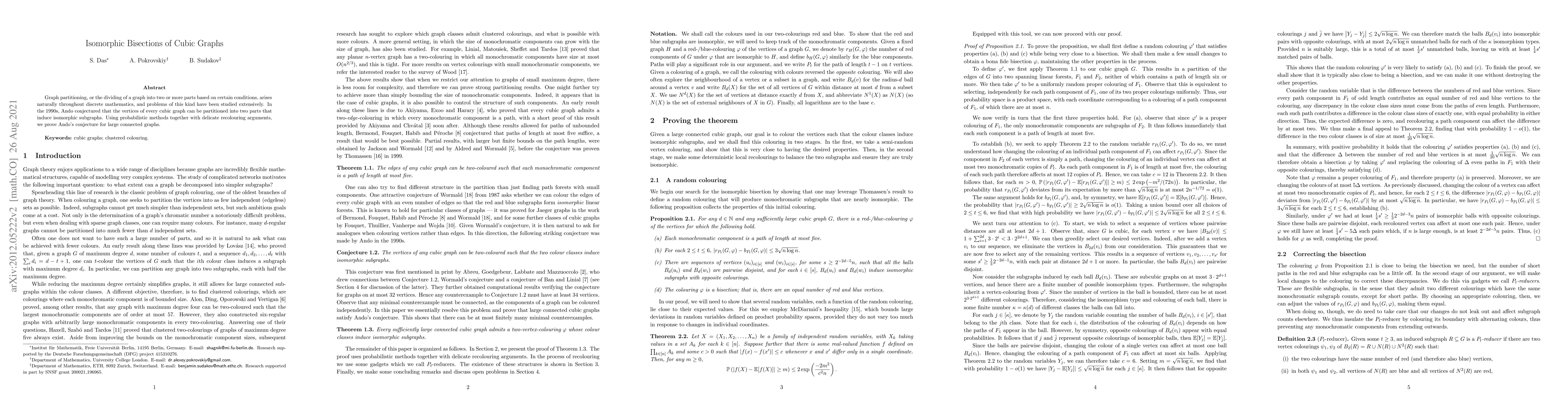This paper proves Ando's 1990s conjecture that cubic graphs can be divided into two vertex sets inducing isomorphic subgraphs, using probabilistic methods and recolouring techniques for large connected graphs.