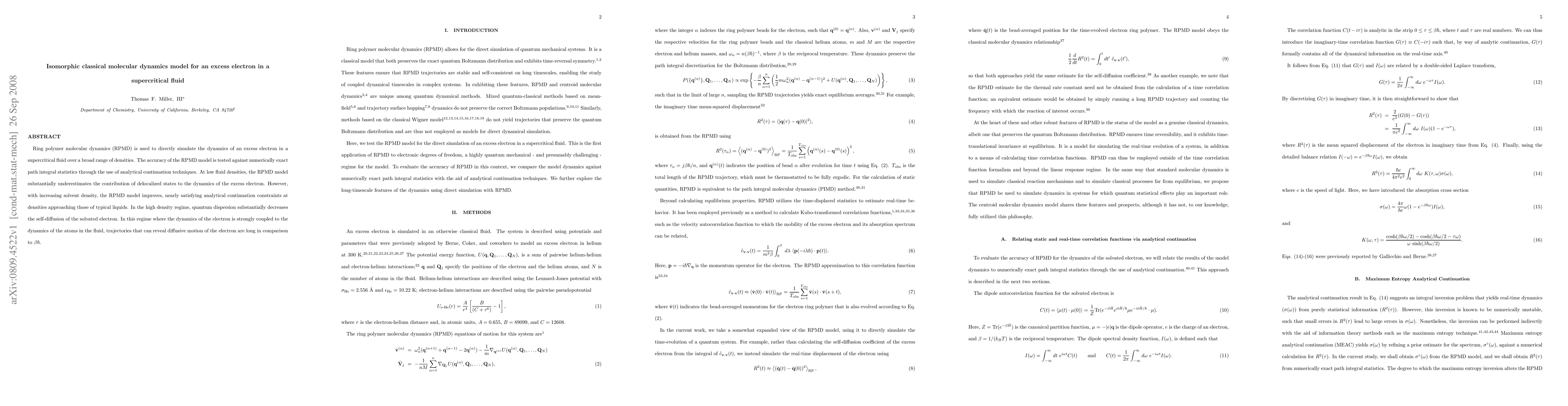 Ring polymer molecular dynamics (RPMD) is used to directly simulate the dynamics of an excess electron in a supercritical fluid over a broad range of densities. The accuracy of the RPMD model is tested against numerically exact path integral statistics through the use of analytical continuation techniques. At low fluid densities, the RPMD model substantially underestimates the contribution of delocalized states to the dynamics of the excess electron. However, with increasing solvent density, the RPMD model improves, nearly satisfying analytical continuation constraints at densities approaching those of typical liquids. In the high density regime, quantum dispersion substantially decreases the self-diffusion of the solvated electron. In this regime where the dynamics of the electron is strongly coupled to the dynamics of the atoms in the fluid, trajectories that can reveal diffusive motion of the electron are long in comparison to $\beta\hbar$.