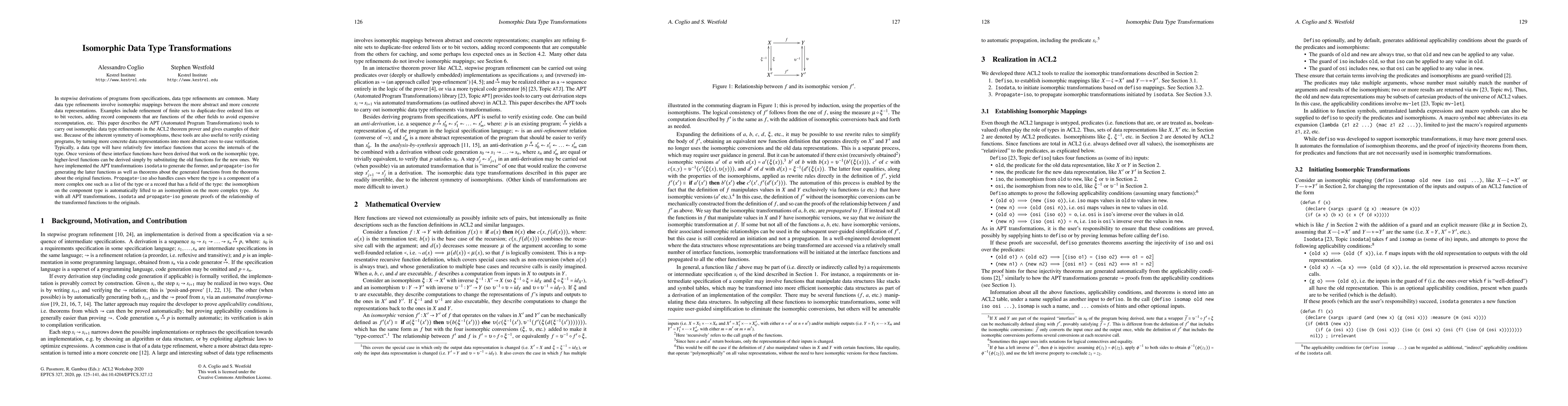 In stepwise derivations of programs from specifications, data type refinements are common. Many data type refinements involve isomorphic mappings between the more abstract and more concrete data representations. Examples include refinement of finite sets to duplicate-free ordered lists or to bit vectors, adding record components that are functions of the other fields to avoid expensive recomputation, etc. This paper describes the APT (Automated Program Transformations) tools to carry out isomorphic data type refinements in the ACL2 theorem prover and gives examples of their use. Because of the inherent symmetry of isomorphisms, these tools are also useful to verify existing programs, by turning more concrete data representations into more abstract ones to ease verification. Typically, a data type will have relatively few interface functions that access the internals of the type. Once versions of these interface functions have been derived that work on the isomorphic type, higher-level functions can be derived simply by substituting the old functions for the new ones. We have implemented the APT transformations isodata to generate the former, and propagate-iso for generating the latter functions as well as theorems about the generated functions from the theorems about the original functions. Propagate-iso also handles cases where the type is a component of a more complex one such as a list of the type or a record that has a field of the type: the isomorphism on the component type is automatically lifted to an isomorphism on the more complex type. As with all APT transformations, isodata and propagate-iso generate proofs of the relationship of the transformed functions to the originals.