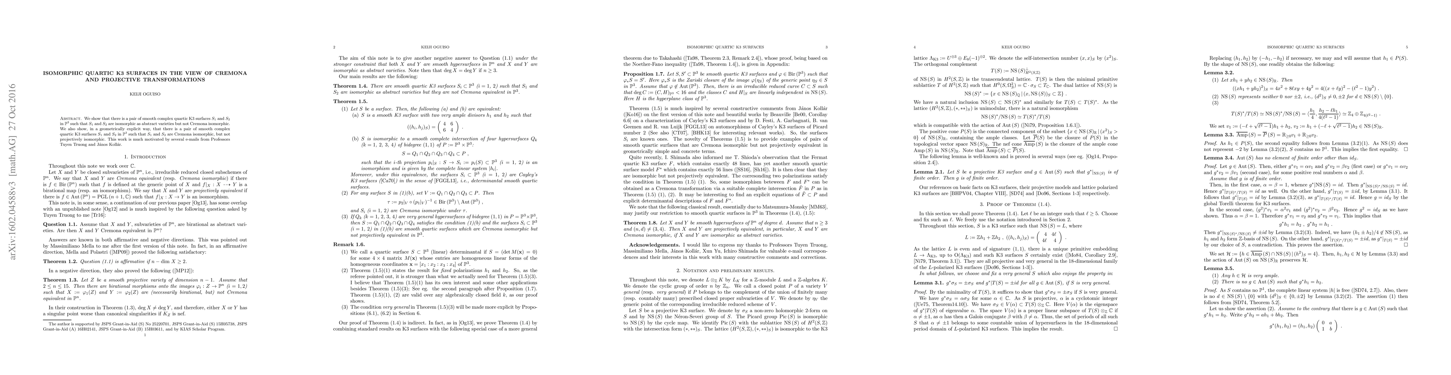 We show that there is a pair of smooth complex quartic K3 surfaces $S_1$ and $S_2$ in ${\mathbf P}^3$ such that $S_1$ and $S_2$ are isomorphic as abstract varieties but not Cremona isomorphic. We also show, in a geometrically explicit way, that there is a pair of smooth complex quartic K3 surfaces $S_1$ and $S_2$ in ${\mathbf P}^3$ such that $S_1$ and $S_2$ are Cremona isomorphic, but not projectively isomorphic. This work is much motivated by several e-mails from Professors Tuyen Truong and J\'anos Koll\'ar.