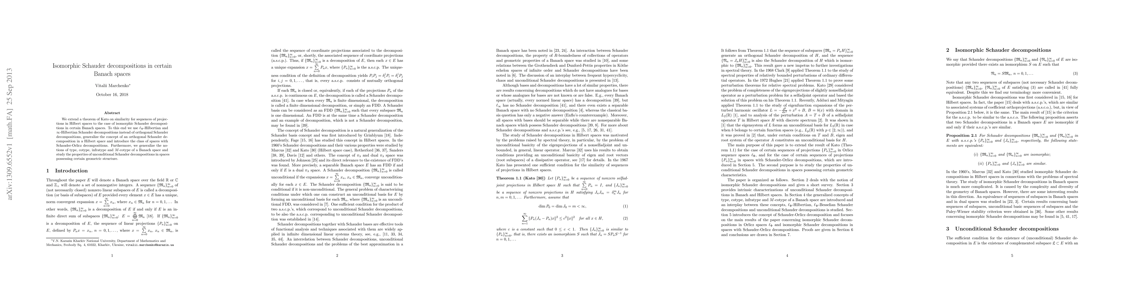 This paper extends Kato's theorem on sequence similarity in Hilbert spaces to Banach spaces by exploring isomorphic Schauder decompositions, utilizing $\ell_{\Psi}$-Hilbertian and $\infty$-Hilbertian Schauder decompositions, and introducing spaces with Schauder-Orlicz decompositions. It also generalizes concepts of type and cotype for Banach spaces and investigates properties of unconditional Schauder decompositions in geometrically structured spaces.