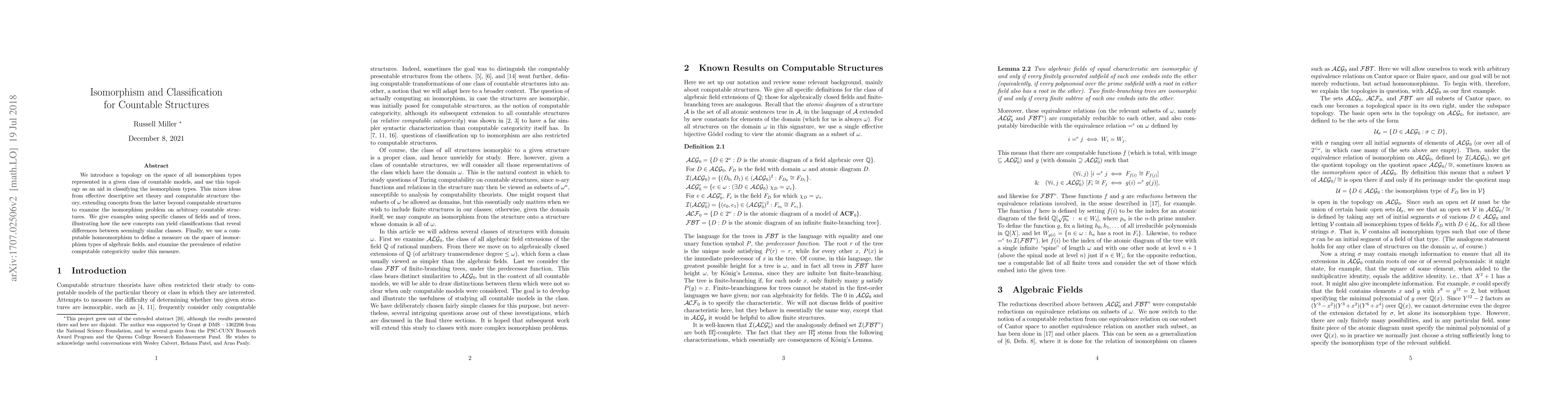 The paper introduces a topology to classify countable model isomorphism types, blending effective descriptive set theory and computable structure theory. It provides classifications for classes of fields and trees, highlighting distinctions and uses a computable homeomorphism to define a measure on algebraic fields, studying relative computable categoricity.