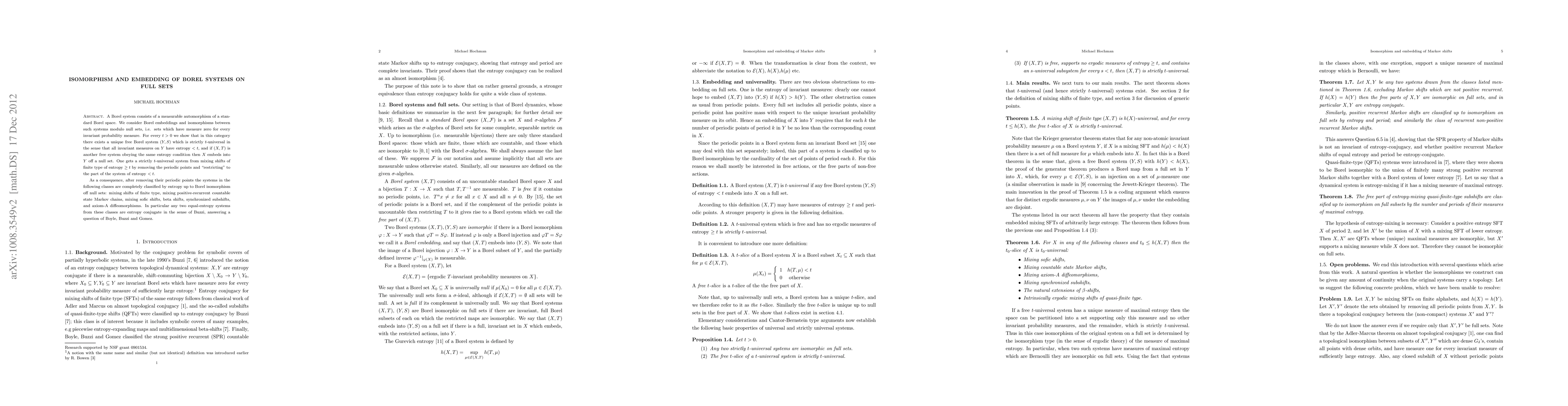 This paper investigates Borel systems, focusing on Borel embeddings and isomorphisms between them, and demonstrates the existence of a unique free Borel system that is strictly t-universal for any given entropy t. It concludes that systems with equal entropy from specified classes are entropy conjugate, thus classifying them up to Borel isomorphism off null sets.