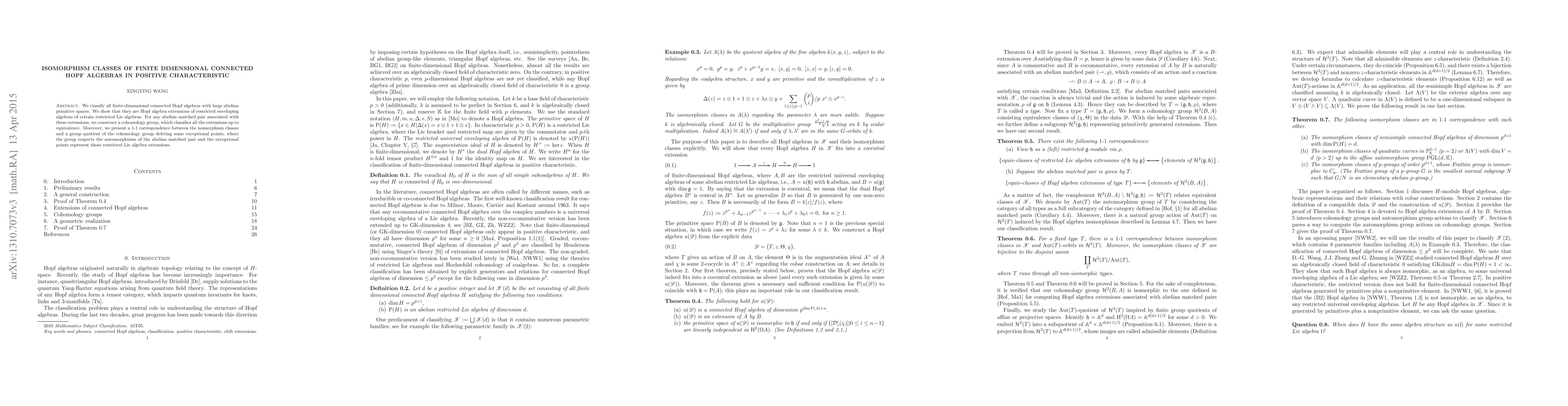 This paper classifies all finite-dimensional connected Hopf algebras with large abelian primitive spaces, showing they arise from extensions of restricted enveloping algebras of specific restricted Lie algebras. A cohomology group is constructed to classify these extensions, establishing a one-to-one correspondence between their isomorphism classes and quotients of this group, excluding exceptional points that correspond to restricted Lie algebra extensions.
